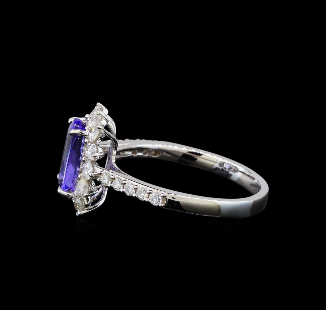 One electronically tested 14KT white gold ladies cast tanzanite and diamond ring with a flat shank with a bright polish finish. Trademark is Orianne. Identified with markings of "14K". Condition is new. Containing: One prong set oval modified brilliant cut natural tanzanite, measuring 9.11 x 6.78 x 3.30mm, approximate weight of 1.43ct., clarity is eye clean, type I, medium light, very slightly grayish, violet color, (GIA V 4/3), cut is good. Fourteen prong set round brilliant cut diamonds, measuring 2.00 - 2.00 x 1.20mm (depth est.) approximate total weight of 14 Stones = 0.41ct. Clarity: SI-1 to SI-2. Color: I - J. Fifteen prong set round brilliant cut diamonds, measuring 1.50 - 1.50 x 0.90mm (depth est.) approximate total weight of 15 Stones = 0.19ct. Clarity: SI-2 to I-1. Color: I - J. All diamonds and colored gemstones are graded in the mounting, unless otherwise stated. Colored gemstones are presumed to have been subjected to commonly used enhancement processes. Total Weight of Colored Stones 1.43ct. Total Weight of Diamonds 0.59ct. Total Weight of Ring 3.20 grams. GGL Appraised at $3,125.00.