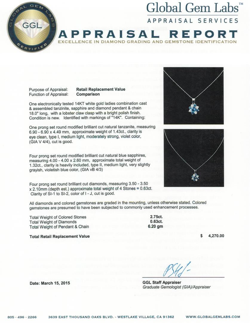 One electronically tested 14KT white gold ladies combination cast & assembled tanzanite, sapphire and diamond pendant & chain 18.0" long, with a lobster claw clasp with a bright polish finish. Identified with markings of "14K". Condition is new. Containing: One prong set round modified brilliant cut natural tanzanite, measuring 6.90 - 6.90 x 4.49 mm, approximate weight of 1.43ct., clarity is eye clean, type I, medium light, moderately strong, violet color, (GIA V 4/4), cut is good. Four prong set round modified brilliant cut natural blue sapphires, measuring 4.00 - 4.00 x 2.60 mm, approximate total weight of 1.32ct., clarity is heavily included, type II, medium light, very slightly grayish, violetish blue color, (GIA vB 4/3). Four prong set round brilliant cut diamonds, measuring 3.50 - 3.50 x 2.10mm (depth est.) approximate total weight of 4 Stones = 0.63ct. Clarity of SI-1 to SI-2, Color of I - J, Cut is Good. All diamonds and colored gemstones are graded in the mounting, unless otherwise stated. Colored gemstones are presumed to have been subjected to commonly used enhancement processes. Total Weight of Colored Stones 2.75ct. Total Weight of Diamonds 0.63ct. Total Weight of Pendant & Chain 6.20 grams. GGL Appraised at $4,270.00.