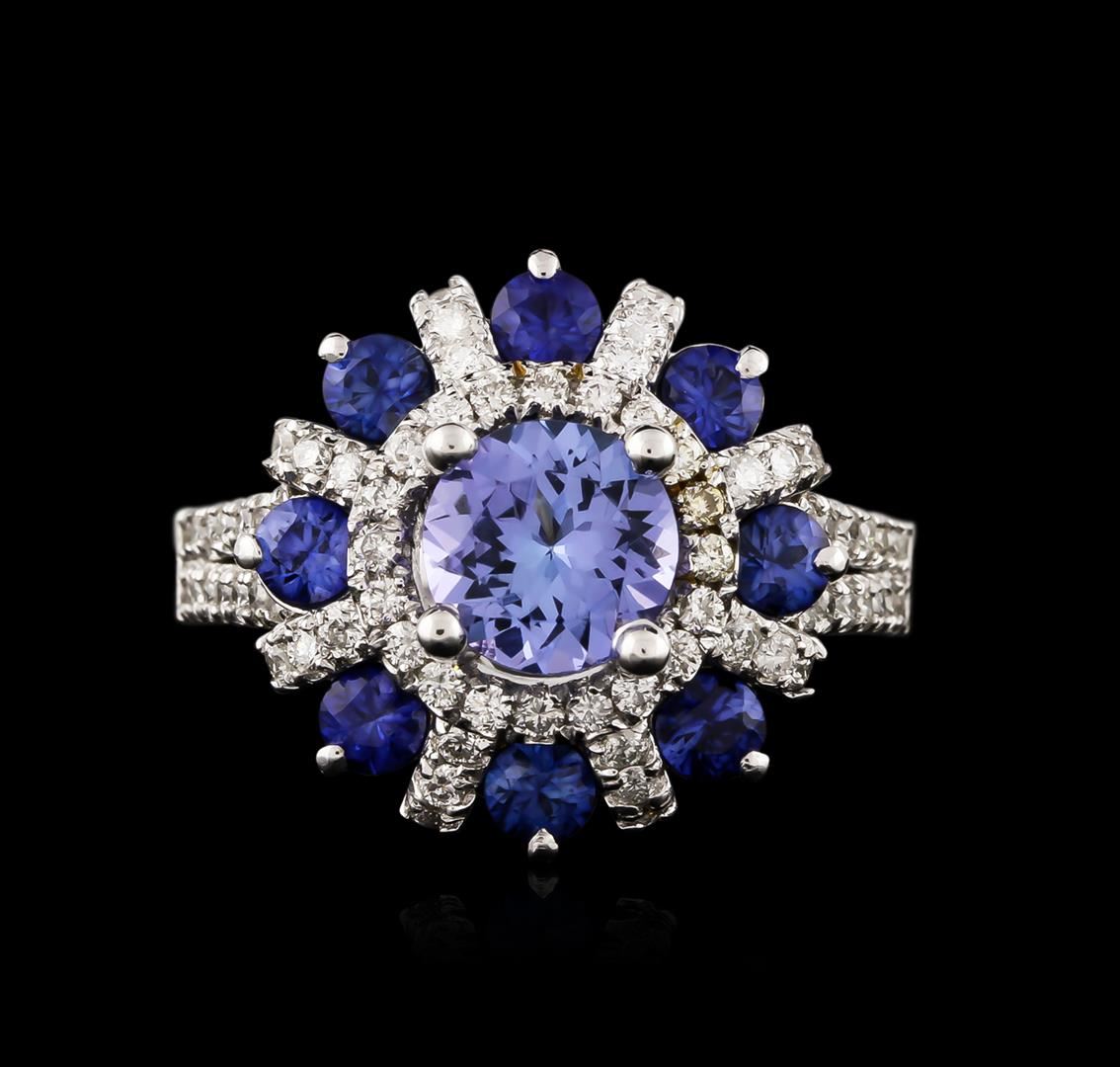 One electronically tested 14KT white gold ladies cast tanzanite, sapphire and diamond ring with a bright polish finish. Identified with markings of "14K". Condition is new. Containing: One prong set round modified brilliant cut natural tanzanite, measuring 6.90 - 6.90 x 4.49 mm, approximate weight of 1.43ct., clarity is eye clean, type I, medium light, very slightly grayish, violet color, (GIA V 4/3), cut is good. Eight prong set round modified brilliant cut natural blue sapphires, measuring 3.00 - 3.00 x 1.95 mm, approximate total weight of 1.12ct., clarity is slightly included, type II, medium, moderately strong, blue color, (GIA B 5/4), cut is good. Seventy-Two prong set round brilliant cut diamonds, measuring 1.30 - 1.30 x 0.78mm (depth est.) approximate total weight of 72 Stones = 0.58ct. Clarity of SI-2 to I-2, Color of I - J, Cut is Good. Colored gemstones are presumed to have been subjected to commonly used enhancement processes. All diamonds and colored gemstones are graded in the mounting, unless otherwise stated. Total Weight of Colored Stones 2.55ct. Total Weight of Diamonds 0.58ct. Total Weight of Ring 6.50 grams. GGL Appraised at $4,425.00.