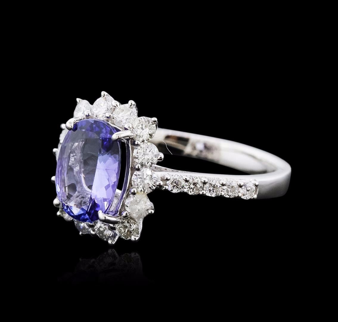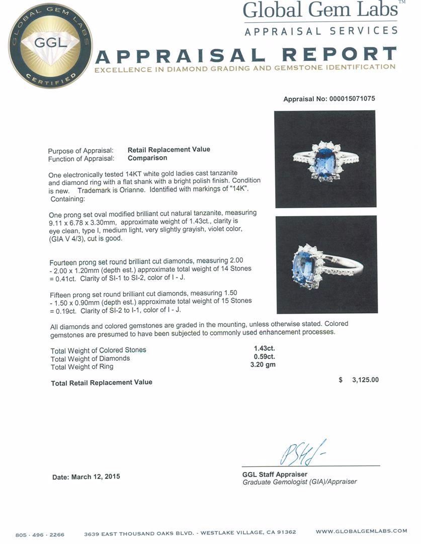 One electronically tested 14KT white gold ladies cast tanzanite and diamond ring with a flat shank with a bright polish finish. Trademark is Orianne. Identified with markings of "14K". Condition is new. Containing: One prong set oval modified brilliant cut natural tanzanite, measuring 9.11 x 6.78 x 3.30mm, approximate weight of 1.43ct., clarity is eye clean, type I, medium light, very slightly grayish, violet color, (GIA V 4/3), cut is good. Fourteen prong set round brilliant cut diamonds, measuring 2.00 - 2.00 x 1.20mm (depth est.) approximate total weight of 14 Stones = 0.41ct. Clarity: SI-1 to SI-2. Color: I - J. Fifteen prong set round brilliant cut diamonds, measuring 1.50 - 1.50 x 0.90mm (depth est.) approximate total weight of 15 Stones = 0.19ct. Clarity: SI-2 to I-1. Color: I - J. All diamonds and colored gemstones are graded in the mounting, unless otherwise stated. Colored gemstones are presumed to have been subjected to commonly used enhancement processes. Total Weight of Colored Stones 1.43ct. Total Weight of Diamonds 0.59ct. Total Weight of Ring 3.20 grams. GGL Appraised at $3,125.00.