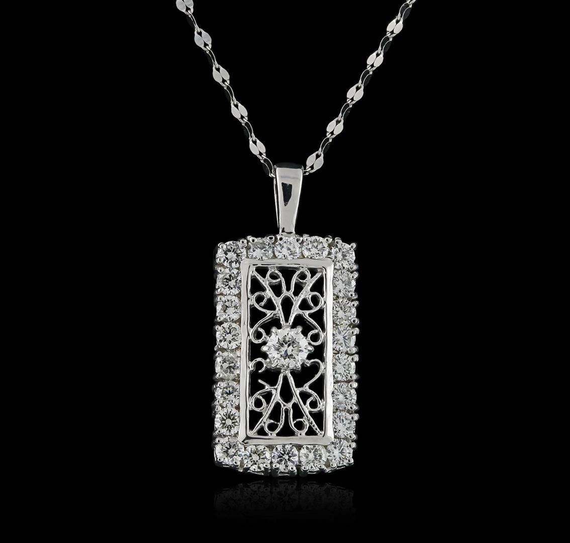 One electronically tested 14KT white gold ladies cast diamond pendant & chain 18.0" long, with a spring ring clasp with a bright polish finish. Condition is new. Containing: One prong set round brilliant cut diamond, measuring 3.50 - 3.50 x 2.10mm (depth est.) approximate total weight of 0.18ct. Clarity: SI-1. Color: H, Cut is Good. Twenty-Two prong set round brilliant cut diamonds, measuring 2.50 - 2.50 x 1.50mm (depth est.) approximate total weight of 22 Stones = 1.25ct. Clarity: SI-1. Color: H - I, Cut is Good. All diamonds are graded in the mounting, unless otherwise stated. Total Weight of Diamonds 1.43ct. Total Weight of Pendant & Chain 4.30 grams. GGL Appraised at $4,185.00.