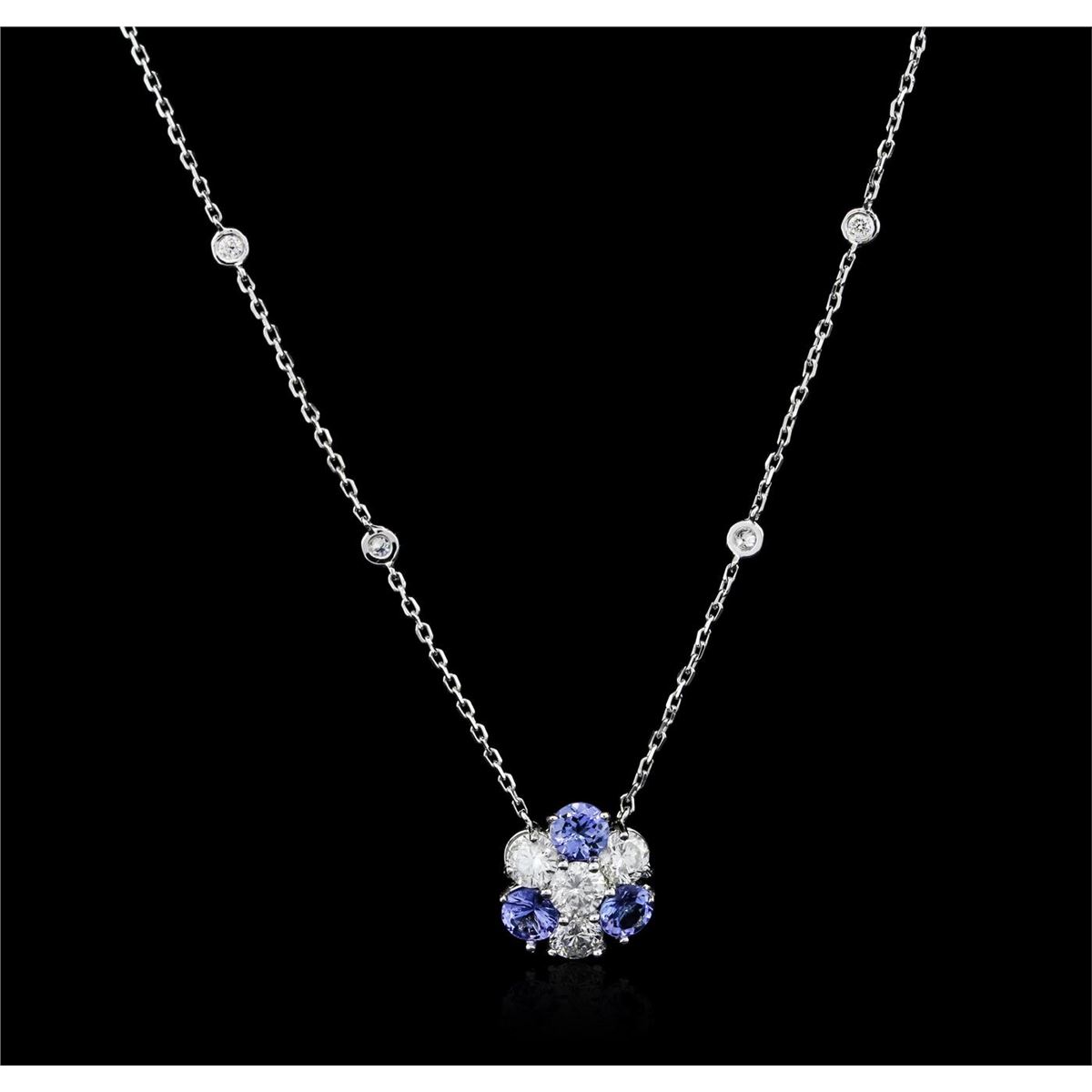 One electronically tested 14KT white gold ladies cast tanzanite and diamond necklace with a lobster claw clasp with a bright polish finish. Measurements: 16" in length Identified with markings of "K14". Condition is new. Containing: Three prong set round modified brilliant cut natural tanzanites, measuring 4.80 - 4.80 x 3.12 mm, approximate total weight of 1.44ct., clarity is eye clean, type I, medium light, very slightly grayish, violet color, (GIA V 4/3), cut is good. Four bezel set round brilliant cut diamonds, measuring 4.50 - 4.50 x 2.70mm (depth est.) approximate total weight of 4 Stones = 1.33ct. Clarity: I-1. Color: I - J, Cut is Good. Eight bezel set round brilliant cut diamonds, measuring 2.00 - 2.00 x 1.20mm (depth est.) approximate total weight of 8 Stones = 0.23ct. Clarity: SI-2 to I-1. Color: I - J, Cut is Good. Colored gemstones are presumed to have been subjected to commonly used enhancement processes. All diamonds and colored gemstones are graded in the mounting, unless otherwise stated. Total Weight of Colored Stones 1.44ct. Total Weight of Diamonds 1.57ct. Total Weight of Necklace 4.40 grams. GGL Appraised at $5,765.00.