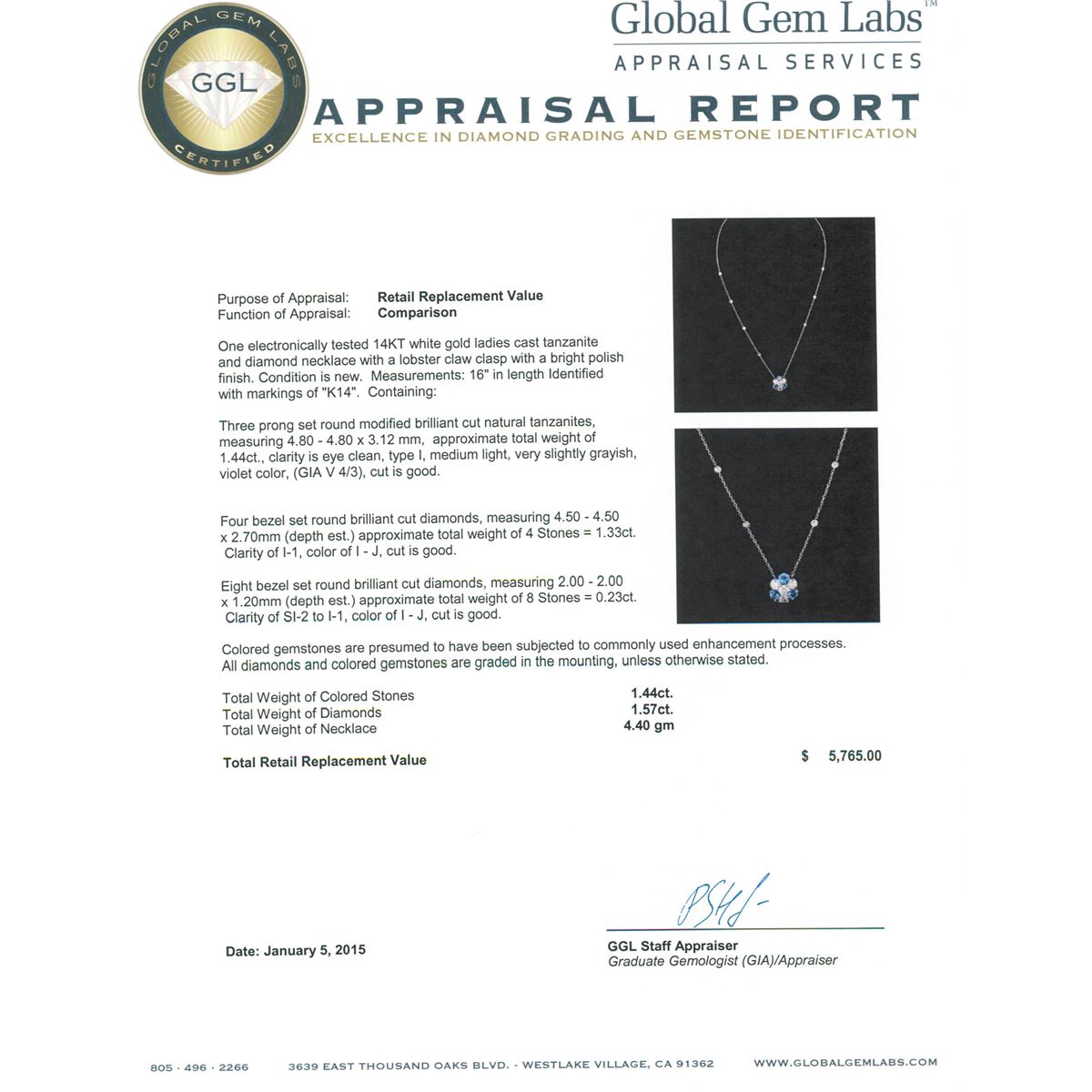 One electronically tested 14KT white gold ladies cast tanzanite and diamond necklace with a lobster claw clasp with a bright polish finish. Measurements: 16" in length Identified with markings of "K14". Condition is new. Containing: Three prong set round modified brilliant cut natural tanzanites, measuring 4.80 - 4.80 x 3.12 mm, approximate total weight of 1.44ct., clarity is eye clean, type I, medium light, very slightly grayish, violet color, (GIA V 4/3), cut is good. Four bezel set round brilliant cut diamonds, measuring 4.50 - 4.50 x 2.70mm (depth est.) approximate total weight of 4 Stones = 1.33ct. Clarity: I-1. Color: I - J, Cut is Good. Eight bezel set round brilliant cut diamonds, measuring 2.00 - 2.00 x 1.20mm (depth est.) approximate total weight of 8 Stones = 0.23ct. Clarity: SI-2 to I-1. Color: I - J, Cut is Good. Colored gemstones are presumed to have been subjected to commonly used enhancement processes. All diamonds and colored gemstones are graded in the mounting, unless otherwise stated. Total Weight of Colored Stones 1.44ct. Total Weight of Diamonds 1.57ct. Total Weight of Necklace 4.40 grams. GGL Appraised at $5,765.00.