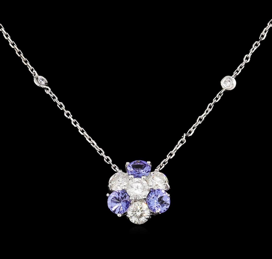 One electronically tested 14KT white gold ladies cast tanzanite and diamond necklace with a lobster claw clasp with a bright polish finish. Measurements: 16" in length Identified with markings of "K14". Condition is new. Containing: Three prong set round modified brilliant cut natural tanzanites, measuring 4.80 - 4.80 x 3.12 mm, approximate total weight of 1.44ct., clarity is eye clean, type I, medium light, very slightly grayish, violet color, (GIA V 4/3), cut is good. Four bezel set round brilliant cut diamonds, measuring 4.50 - 4.50 x 2.70mm (depth est.) approximate total weight of 4 Stones = 1.33ct. Clarity: I-1. Color: I - J, Cut is Good. Eight bezel set round brilliant cut diamonds, measuring 2.00 - 2.00 x 1.20mm (depth est.) approximate total weight of 8 Stones = 0.23ct. Clarity: SI-2 to I-1. Color: I - J, Cut is Good. Colored gemstones are presumed to have been subjected to commonly used enhancement processes. All diamonds and colored gemstones are graded in the mounting, unless otherwise stated. Total Weight of Colored Stones 1.44ct. Total Weight of Diamonds 1.57ct. Total Weight of Necklace 4.40 grams. GGL Appraised at $5,765.00.