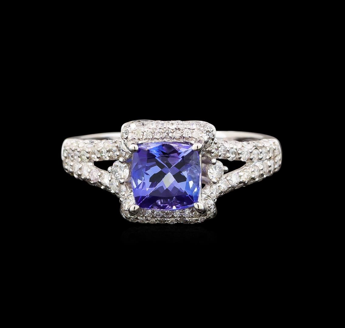 One electronically tested 14KT white gold ladies cast tanzanite and diamond ring with a flat shank with a bright polish finish. Trademark is Orianne. Identified with markings of "14K". Condition is new. Containing: One prong set square cushion modified brilliant cut natural tanzanite, measuring 6.60 x 6.50 x 4.26mm, approximate weight of 1.44ct., clarity is eye clean, type I, medium, very slightly grayish, violet color, (GIA V 5/3), cut is good. One Hundred Twenty-Two prong set round brilliant cut diamonds, measuring 1.80 - 1.10 x 0.87mm (depth est.) approximate total weight of 122 Stones = 0.50ct. Clarity: SI-2 to I-2. Color: I - J, Cut is Good. All diamonds and colored gemstones are graded in the mounting, unless otherwise stated. Colored gemstones are presumed to have been subjected to commonly used enhancement processes.. Total Weight of Colored Stones 1.44ct. Total Weight of Diamonds 0.50ct. Total Weight of Ring 3.30 grams. GGL Appraised at $3,400.00.