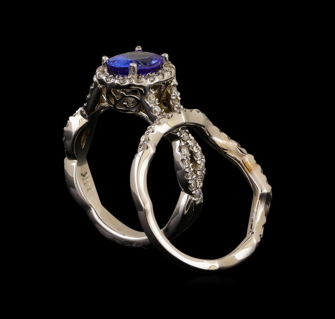 One electronically tested 14KT white gold ladies cast tanzanite and diamond ring and guard with a bright polish finish. Identified with markings of "14K". Condition is new. Containing: One prong set oval modified brilliant cut natural tanzanite, measuring 8.20 x 6.20 x 4.03mm, approximate weight of 1.44ct., clarity is eye clean, type I, medium light, very slightly grayish, violet color, (GIA V 4/3), cut is good. Seventy-Five prong set round brilliant cut diamonds, measuring 1.30 - 1.30 x 0.78mm (depth est.) approximate total weight of 75 Stones = 0.60ct. Clarity: I-1 to I-2. Color: I - J, Cut is Good. Colored gemstones are presumed to have been subjected to commonly used enhancement processes. All diamonds and colored gemstones are graded in the mounting, unless otherwise stated. Total Weight of Colored Stones 1.44ct. Total Weight of Diamonds 0.60ct. Total Weight of Ring And Guard 7.90 grams. GGL Appraised at $5,095.00.