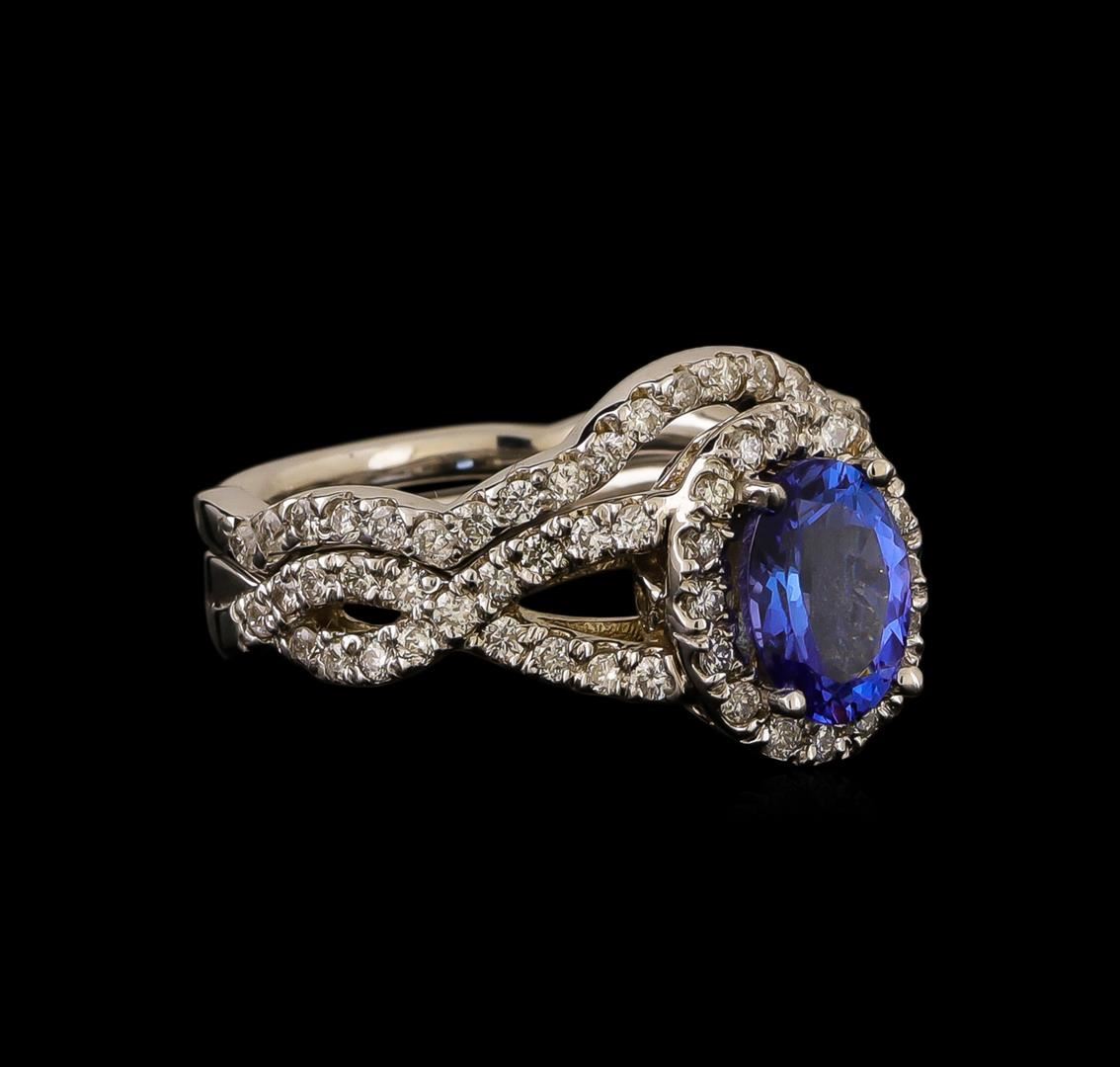 One electronically tested 14KT white gold ladies cast tanzanite and diamond ring and guard with a bright polish finish. Identified with markings of "14K". Condition is new. Containing: One prong set oval modified brilliant cut natural tanzanite, measuring 8.20 x 6.20 x 4.03mm, approximate weight of 1.44ct., clarity is eye clean, type I, medium light, very slightly grayish, violet color, (GIA V 4/3), cut is good. Seventy-Five prong set round brilliant cut diamonds, measuring 1.30 - 1.30 x 0.78mm (depth est.) approximate total weight of 75 Stones = 0.60 ct. Clarity: I-1 to I-2. Color: I - J, Cut is Good. Colored gemstones are presumed to have been subjected to commonly used enhancement processes. All diamonds and colored gemstones are graded in the mounting, unless otherwise stated. Total Weight of Colored Stones 1.44ct. Total Weight of Diamonds 0.60 ct. Total Weight of Ring And Guard 7.90 grams. GGL Appraised.