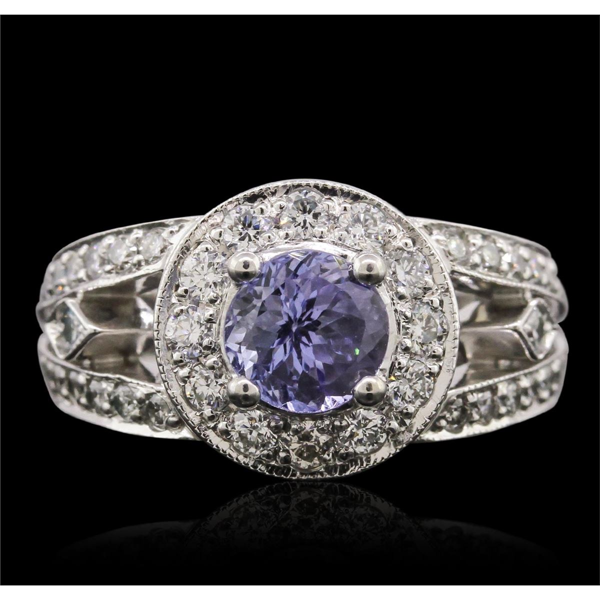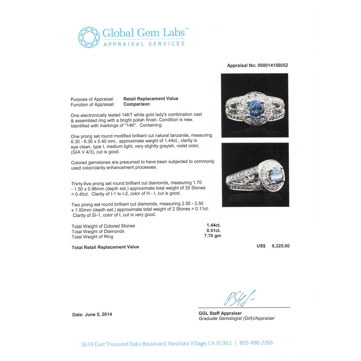 One electronically tested 14KT white gold Ladies combination cast & assembled ring with a bright polish finish. Condition is new. Identified with markings of "14K". Containing: One prong set round modified brilliant cut natural tanzanite, measuring 6.30 - 6.30 x 5.40 mm, approximate weight of 1.44ct., clarity is eye clean, type I, medium light, very slightly grayish, violet color, (GIA V 4/3), cut is good. Colored gemstones are presumed to have been subjected to commonly used color/clarity enhancement processes. Thirty-Five prong set round brilliant cut diamonds, measuring 1.90 - 1.50 x 1.02mm (depth est.) approximate total weight of 35 Stones = 0.50ct. Clarity of I-1 to I-2, Color of H - I, Cut is Good. Total Weight of Colored Stones 1.44ct. Total Weight of Diamonds 0.50ct. Total Weight of Ring 7.70 grams. GGL Appraised at $6,020.00.