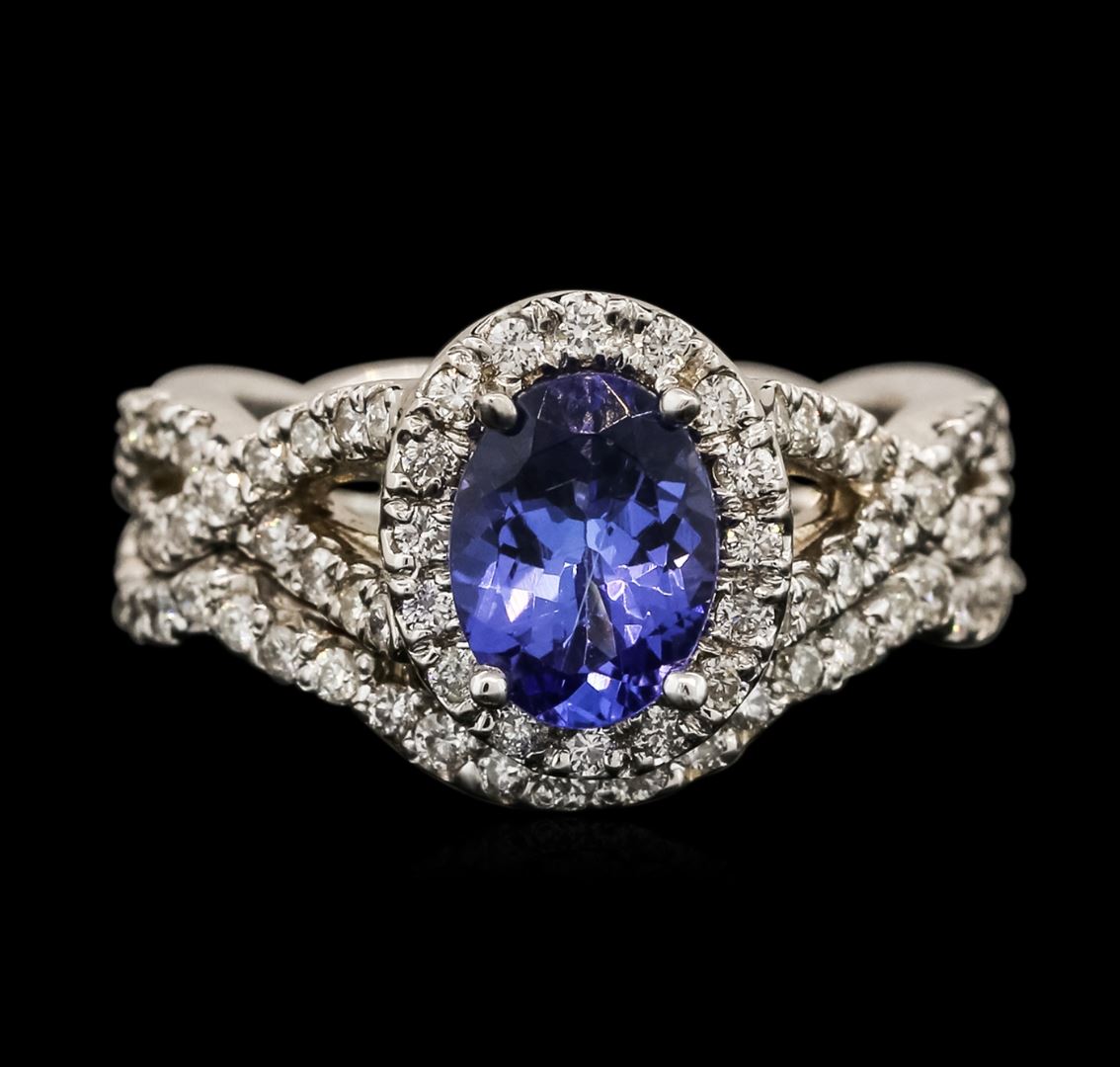 One electronically tested 14KT white gold ladies cast tanzanite and diamond ring and guard with a bright polish finish. Identified with markings of "14K". Condition is new. Containing: One prong set oval modified brilliant cut natural tanzanite, measuring 8.20 x 6.20 x 4.03mm, approximate weight of 1.44ct., clarity is eye clean, type I, medium light, very slightly grayish, violet color, (GIA V 4/3), cut is good. Seventy-Five prong set round brilliant cut diamonds, measuring 1.30 - 1.30 x 0.78mm (depth est.) approximate total weight of 75 Stones = 0.60ct. Clarity: I-1 to I-2. Color: I - J, Cut is Good. Colored gemstones are presumed to have been subjected to commonly used enhancement processes. All diamonds and colored gemstones are graded in the mounting, unless otherwise stated. Total Weight of Colored Stones 1.44ct. Total Weight of Diamonds 0.60ct. Total Weight of Ring And Guard 7.90 grams. GGL Appraised at $5,095.00.