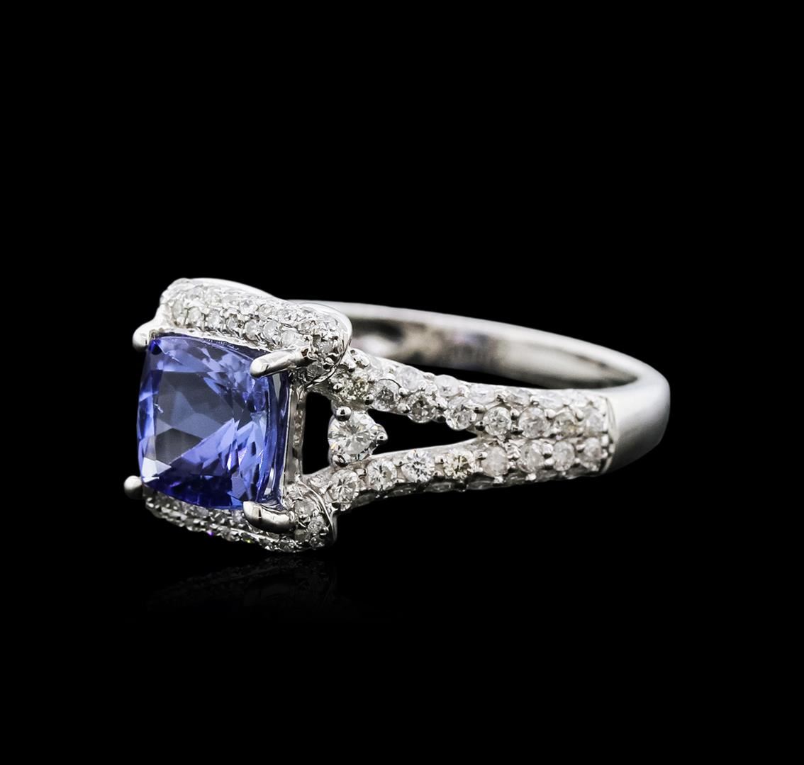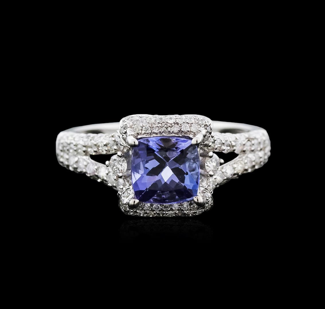 One electronically tested 14KT white gold ladies cast tanzanite and diamond ring with a flat shank with a bright polish finish. Trademark is Orianne. Identified with markings of "14K". Condition is new. Containing: One prong set square cushion modified brilliant cut natural tanzanite, measuring 6.60 x 6.50 x 4.26mm, approximate weight of 1.44ct., clarity is eye clean, type I, medium, very slightly grayish, violet color, (GIA V 5/3), cut is good. One Hundred Twenty-Two prong set round brilliant cut diamonds, measuring 1.80 - 1.10 x 0.87mm (depth est.) approximate total weight of 122 Stones = 0.50ct. Clarity: SI-2 to I-2. Color: I - J, Cut is Good. All diamonds and colored gemstones are graded in the mounting, unless otherwise stated. Colored gemstones are presumed to have been subjected to commonly used enhancement processes.. Total Weight of Colored Stones 1.44ct. Total Weight of Diamonds 0.50ct. Total Weight of Ring 3.30 grams. GGL Appraised at $3,400.00.