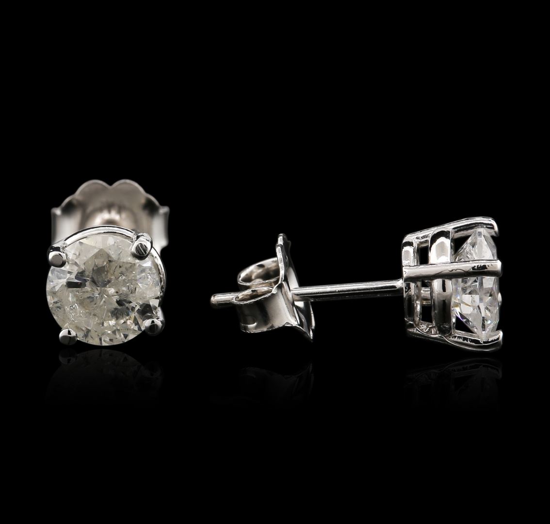 One pair electronically tested 14KT white gold ladies cast diamond stud earrings with friction posts with a bright polish finish. Identified with markings of "14K". Condition is new. Containing: Two prong set round brilliant cut diamonds, measuring 5.80 - 5.80 x 3.50mm (depth est.) approximate total weight of 2 Stones = 1.44ct. Clarity: I-3 to I-3. Color: H - I, Cut is Good. Diamonds are graded in the mounting, unless otherwise stated. Total Weight of Diamonds 1.44ct. Total Weight of Stud Earrings 1.30 grams. GGL Appraised at $2,795.00.