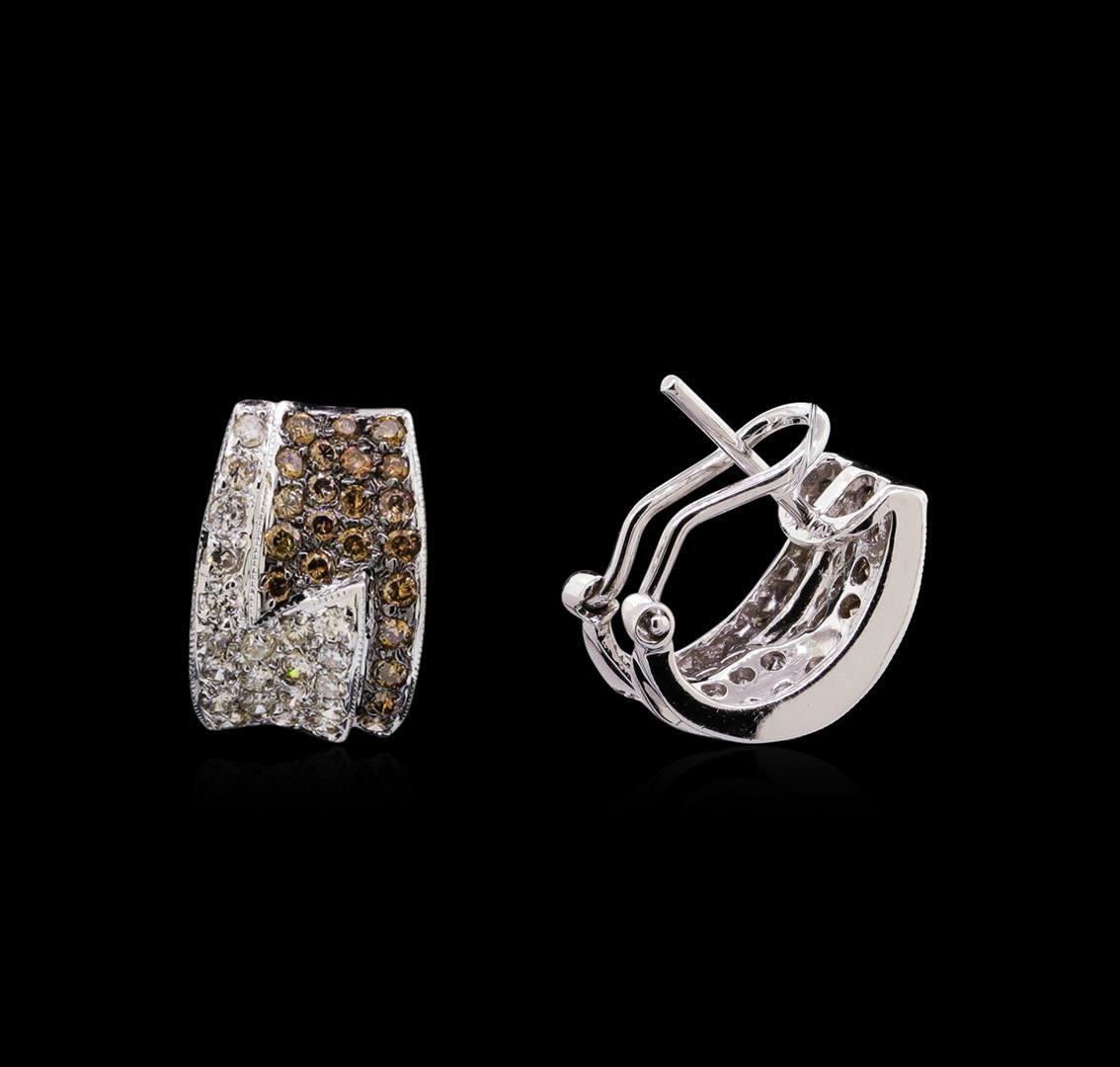 One pair electronically tested 14KT white gold ladies cast & assembled diamond earrings with omega backs. Condition is new, good workmanship. Bright and anodized finish with milgrain detailing throughout. Identified with markings of "14K". Containing: Forty-two bead set round brilliant cut diamonds, measuring 1.60 - 1.50 x 0.93mm (depth est.) approximate total weight of 42 Stones = 0.63ct. Faint brown secondary. Color throughout. Graded in the setting. Clarity SI-2 to I-1. Color H -- J. Forty-four bead set round brilliant cut diamonds, measuring 1.70 - 1.60 x 0.99mm (depth est.) approximate total weight of 44 Stones = 0.82ct. Graded in the setting. Clarity SI-2 to I-2. Color Fancy Brown. Total Weight of Diamonds 1.45ct. Total Weight of Earrings 6.20gm. AIG Appraised.