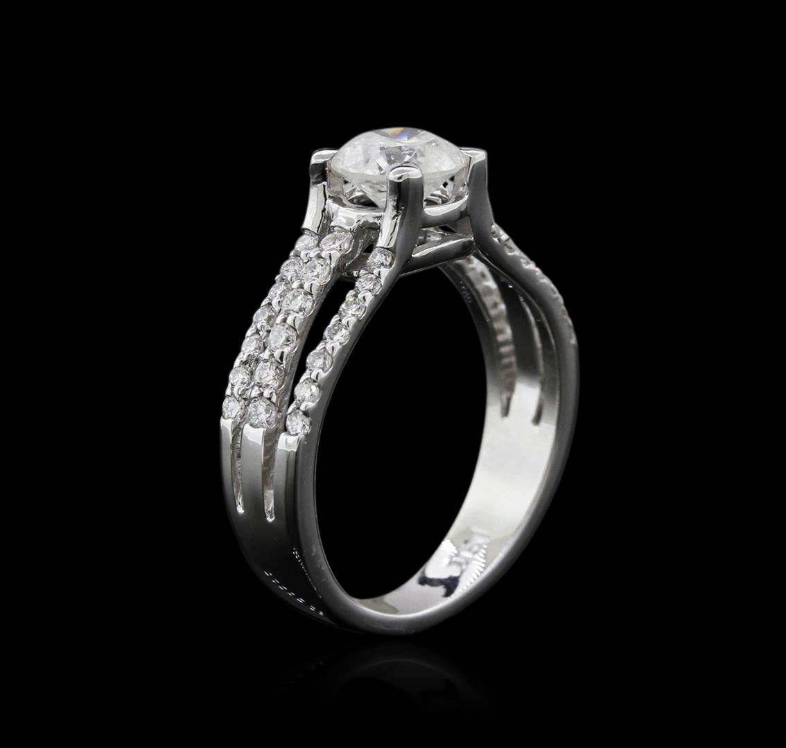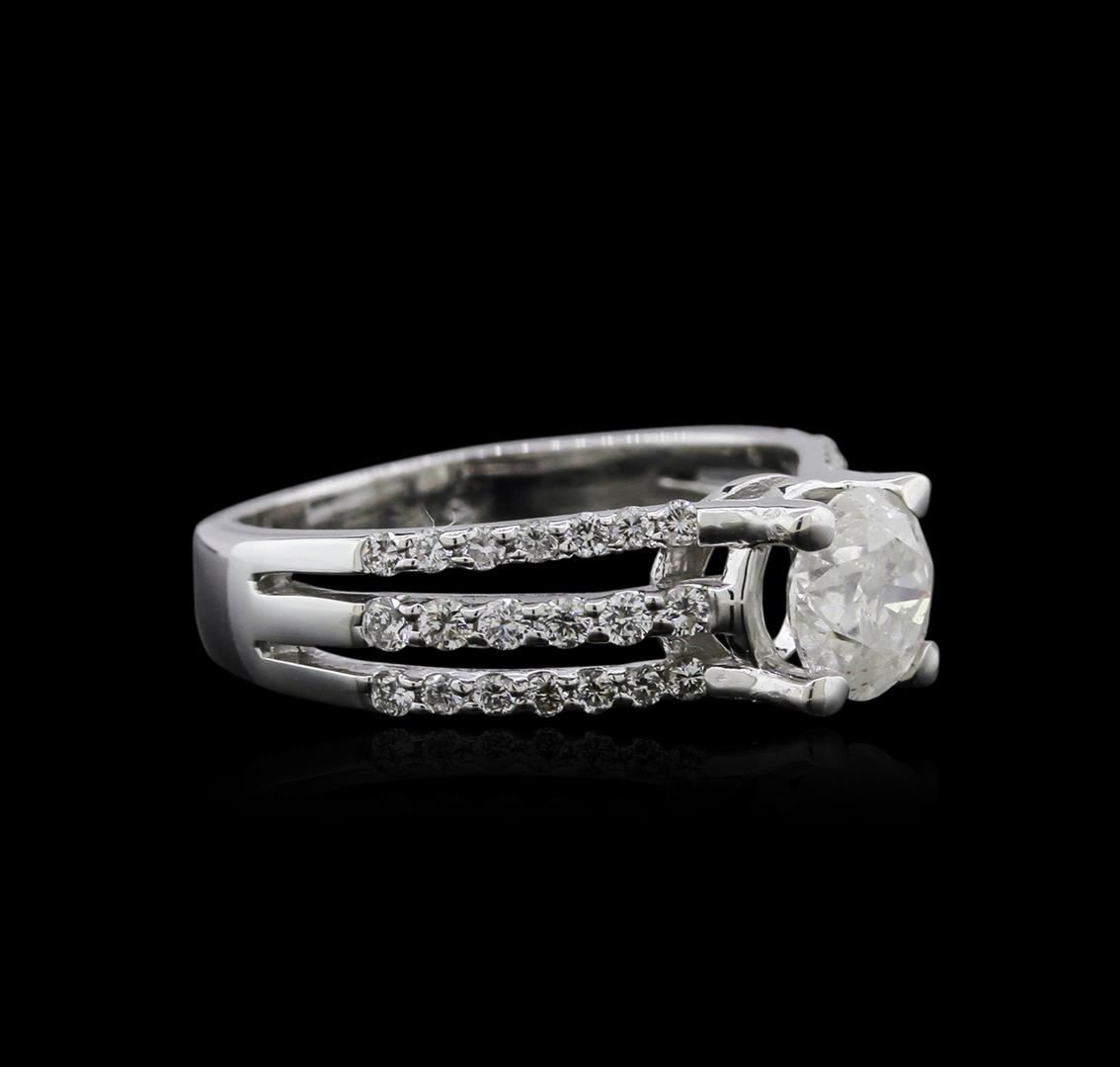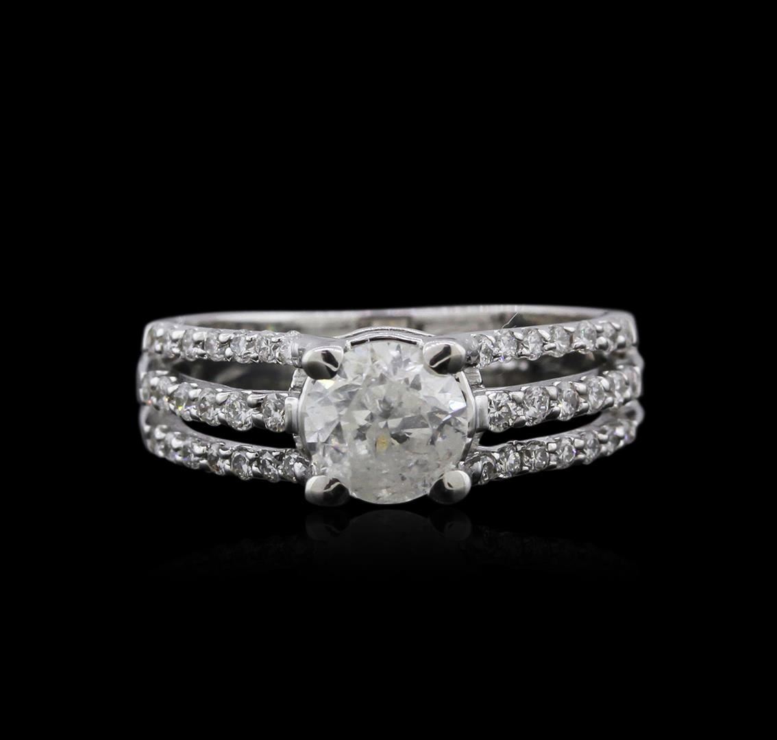 One electronically tested 14KT white gold ladies cast diamond engagement ring with a bright polish finish. Identified with markings of "18K". Condition is new. Containing: One prong set round brilliant cut diamond, measuring 6.50 - 6.50 x 4.30mm (depth est.) approximate weight of 1.11ct. Clarity: I-3. Color: J, Cut is Good. Thirty-Eight prong set round brilliant cut diamonds, measuring 1.40 - 1.30 x 0.81mm (depth est.) approximate total weight of 38 Stones = 0.34ct. Clarity: SI-1 to I-1. Color: J, Cut is Good. All diamonds are graded in the mounting, unless otherwise stated. Total Weight of Diamonds 1.45ct. Total Weight of Engagement Ring 5.10 grams. GGL Appraised at $5,415.00.