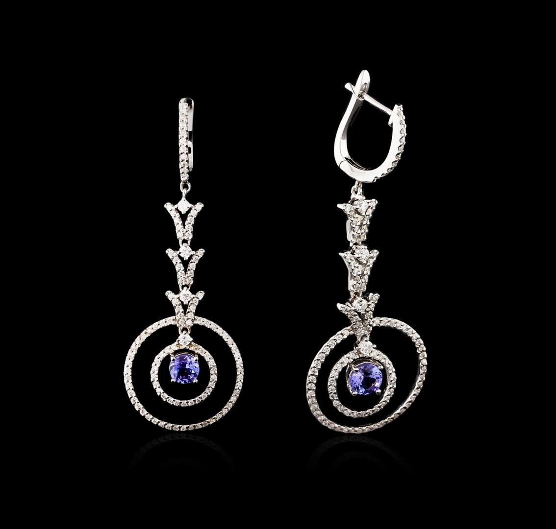 One pair electronically tested 14KT white gold ladies cast tanzanite and diamond earrings with hinged clip backs with a bright polish finish. Identified with markings of "14K". Condition is new. Containing: Two prong set round modified brilliant cut natural tanzanites, measuring 5.50 - 5.50 x 3.58 mm, approximate total weight of 1.46ct., clarity is eye clean, type I, medium light, very slightly grayish, violet color, (GIA V 4/3), cut is good. Two Hundred Ten prong set round brilliant cut diamonds, measuring 1.30 - 1.30 x 0.78mm (depth est.) approximate total weight of 210 Stones = 1.68ct. Clarity of I-1 to I-2, Color of I - J, Cut is Good. Eight prong set round brilliant cut diamonds, measuring 2.30 - 2.30 x 1.38mm (depth est.) approximate total weight of 8 Stones = 0.36ct. Clarity of SI-1 to I-1, Color of I - J, Cut is Good. Colored gemstones are presumed to have been subjected to commonly used enhancement processes. All diamonds and colored gemstones are graded in the mounting, unless otherwise stated. Total Weight of Colored Stones 1.46ct. Total Weight of Diamonds 2.04ct. Total Weight of Earrings 12.10 grams. GGL Appraised at $5,200.00.