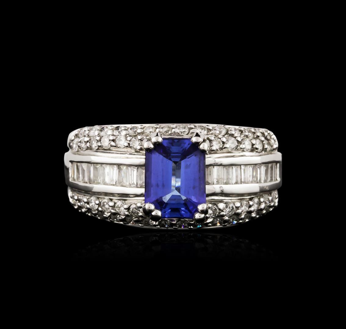 One electronically tested 14KT white gold ladies cast tanzanite and diamond ring with a bright polish finish. The featured tanzanite is supported by diamond set shoulders, completed by a three and one-half millimeter wide band. Identified with markings of "14K". Condition is new, good workmanship. Containing: One prong set emerald step cut natural tanzanite, measuring 7.65 x 5.70 x 3.50mm, 6%. bulge factor, approximate weight of 1.46ct., clarity is eye clean, type I, medium dark, moderately strong, violetish blue color, (GIA vB 6/4), cut is good. Transmitting light with no distortion, transparent. Graded in the setting. Tanzanite is a very rare gemstone that is only found in the country of Tanzania. Originally discovered in 1967. Tiffany & Company, named the stone Tanzanite. It is found in the Usumburu Mountains that border the Umba Valley of northern Tanzania. Tanzanite occurs in gray, brown, violet, blue, reddish-purple, & green. The gem is interesting because of its exceptional pleochroism. Rotated in different directions a tanzanite will exhibit multiple changes of color. Tanzanite has a low tolerance to ultrasonic cleaning, and should not be cleaned using this method. Fifty-Two prong set round brilliant cut diamonds, measuring 1.50 - 1.40 x 0.87mm (depth est.) approximate total weight of 52 Stones = 0.67ct. Graded in the setting. Clarity: SI-2 to I-1. Color: G - I Twenty channel set baguette cut diamonds, measuring from 2.00 x 1.10 x 0.77mm (depth est.) to 2.10 x 1.20 x 0.84mm (depth est.) approximate total weight of 20 Stones = 0.34ct. Graded in the setting. Clarity: SI-1 to SI-2. Color: H - I. Total Weight of Colored Stones 1.46ct. Total Weight of Diamonds 1.01ct. Total Weight of Ring 6.09 grams. AIG Appraised at $6,710.00.