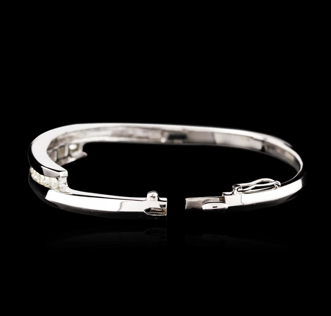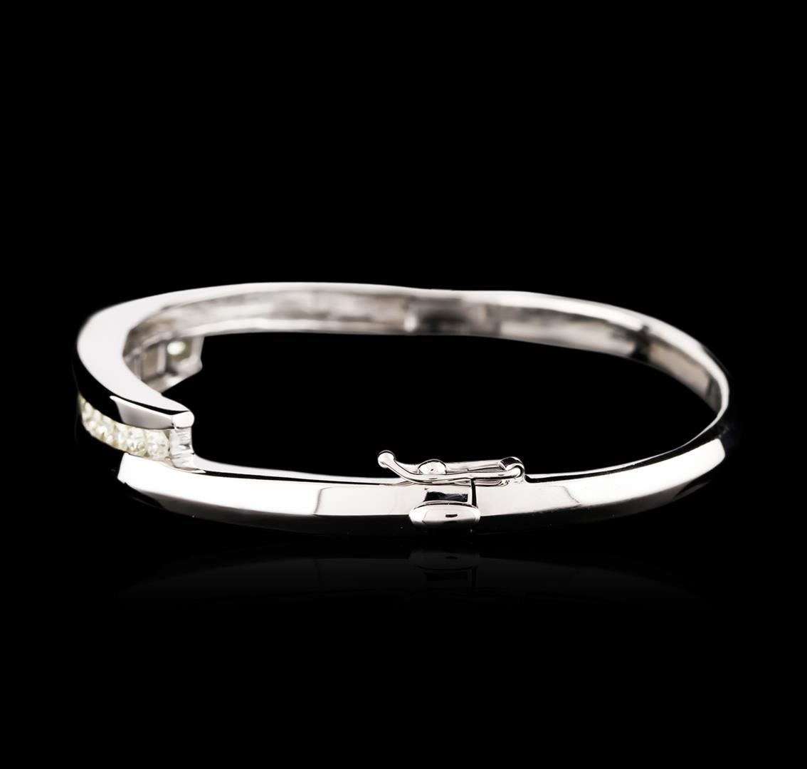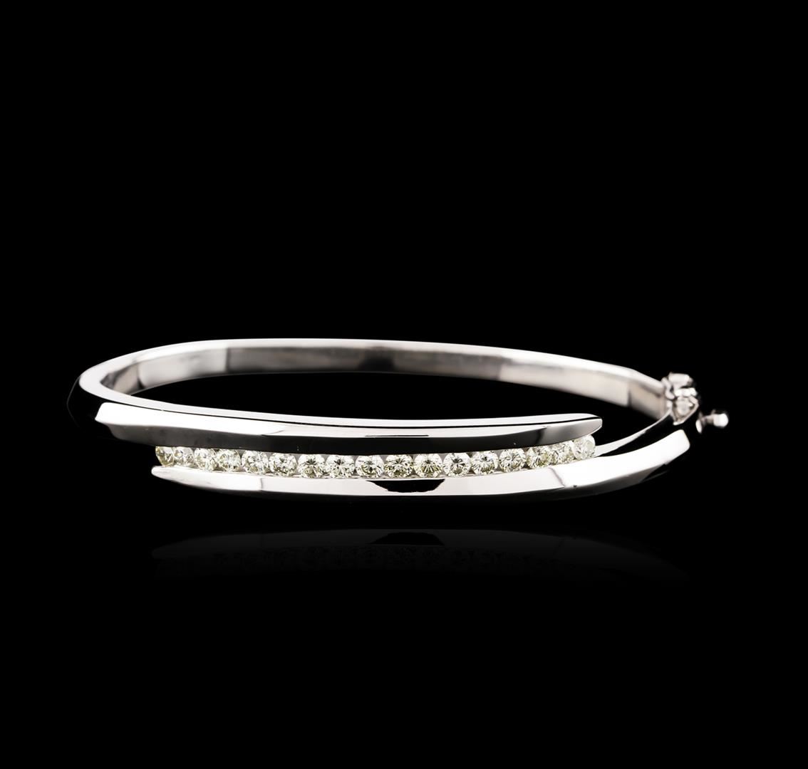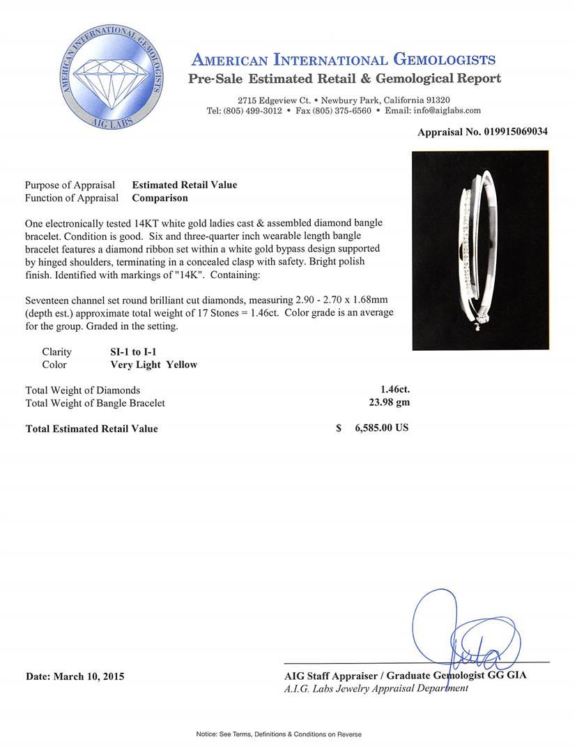 One electronically tested 14KT white gold ladies cast & assembled diamond bangle bracelet. Six and three-quarter inch wearable length bangle bracelet features a diamond ribbon set within a white gold bypass design supported by hinged shoulders, terminating in a concealed clasp with safety. Bright polish finish. Identified with markings of "14K". Condition is good. Containing: Seventeen channel set round brilliant cut diamonds, measuring 2.90 - 2.70 x 1.68mm (depth est.) approximate total weight of 17 Stones = 1.46ct. Color grade is an average for the group. Graded in the setting. Clarity: SI-1 to I-1. Total Weight of Diamonds 1.46ct. Total Weight of Bangle Bracelet 23.98 grams. AIG Appraised at $6,585.00.