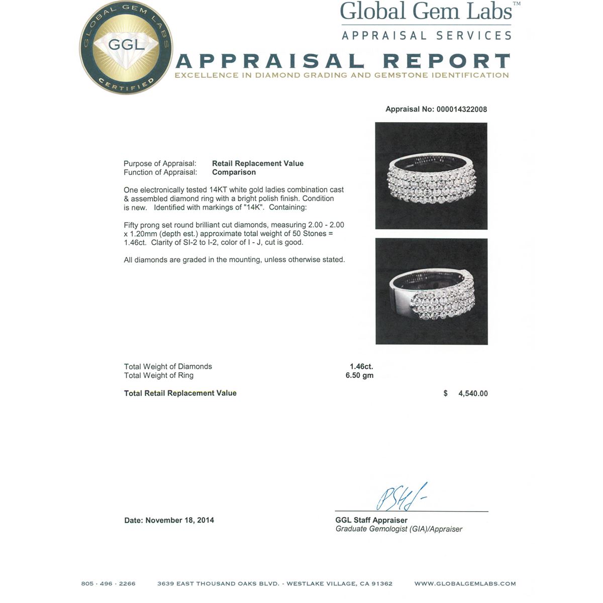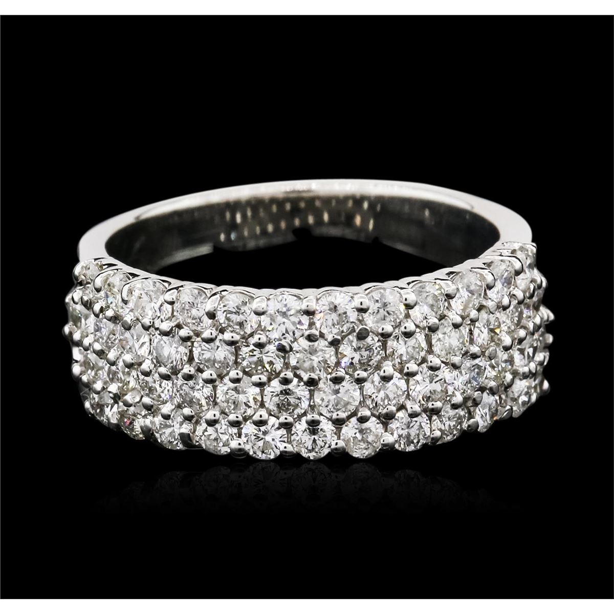 One electronically tested 14KT white gold ladies combination cast & assembled diamond ring with a bright polish finish. Identified with markings of "14K". Condition is new. Containing: Fifty prong set round brilliant cut diamonds, measuring 2.00 - 2.00 x 1.20mm (depth est.) approximate total weight of 50 Stones = 1.46ct. Clarity: SI-2 to I-2. Color: I - J, Cut is Good. All diamonds are graded in the mounting, unless otherwise stated. Total Weight of Diamonds 1.46ct. Total Weight of Ring 6.50 grams. GGL Appraised at $4,540.00.