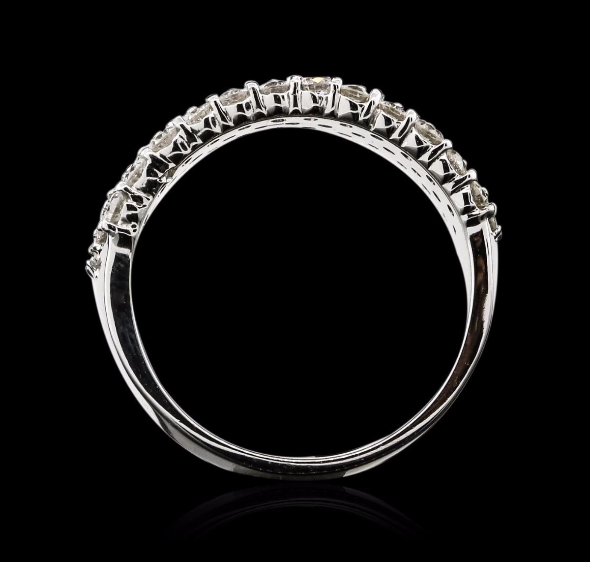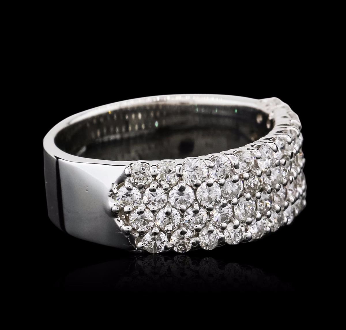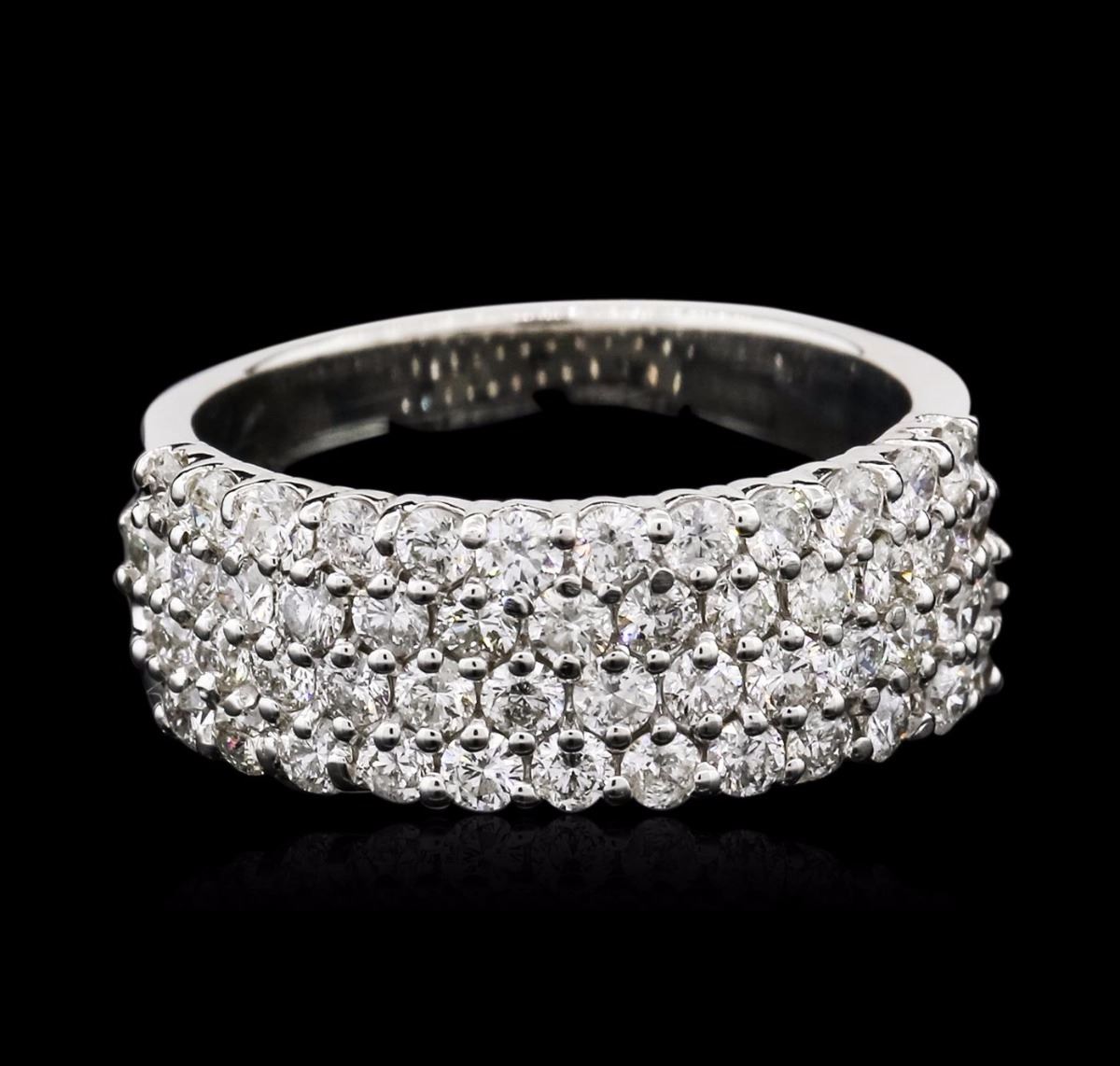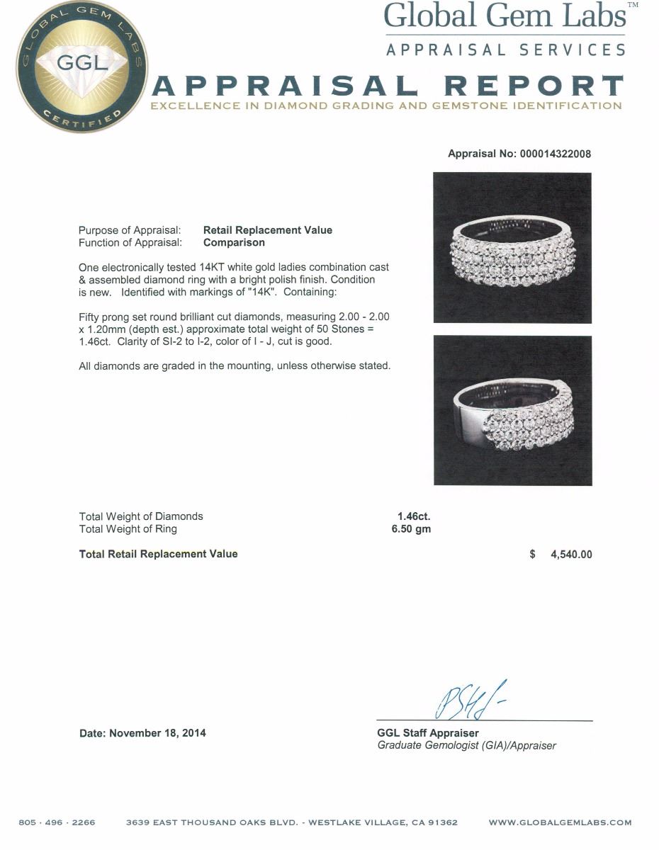 One electronically tested 14KT white gold ladies combination cast & assembled diamond ring with a bright polish finish. Identified with markings of "14K". Condition is new. Containing: Fifty prong set round brilliant cut diamonds, measuring 2.00 - 2.00 x 1.20mm (depth est.) approximate total weight of 50 Stones = 1.46ct. Clarity: SI-2 to I-2. Color: I - J, Cut is Good. All diamonds are graded in the mounting, unless otherwise stated. Total Weight of Diamonds 1.46ct. Total Weight of Ring 6.50 grams. GGL Appraised at $4,540.00.