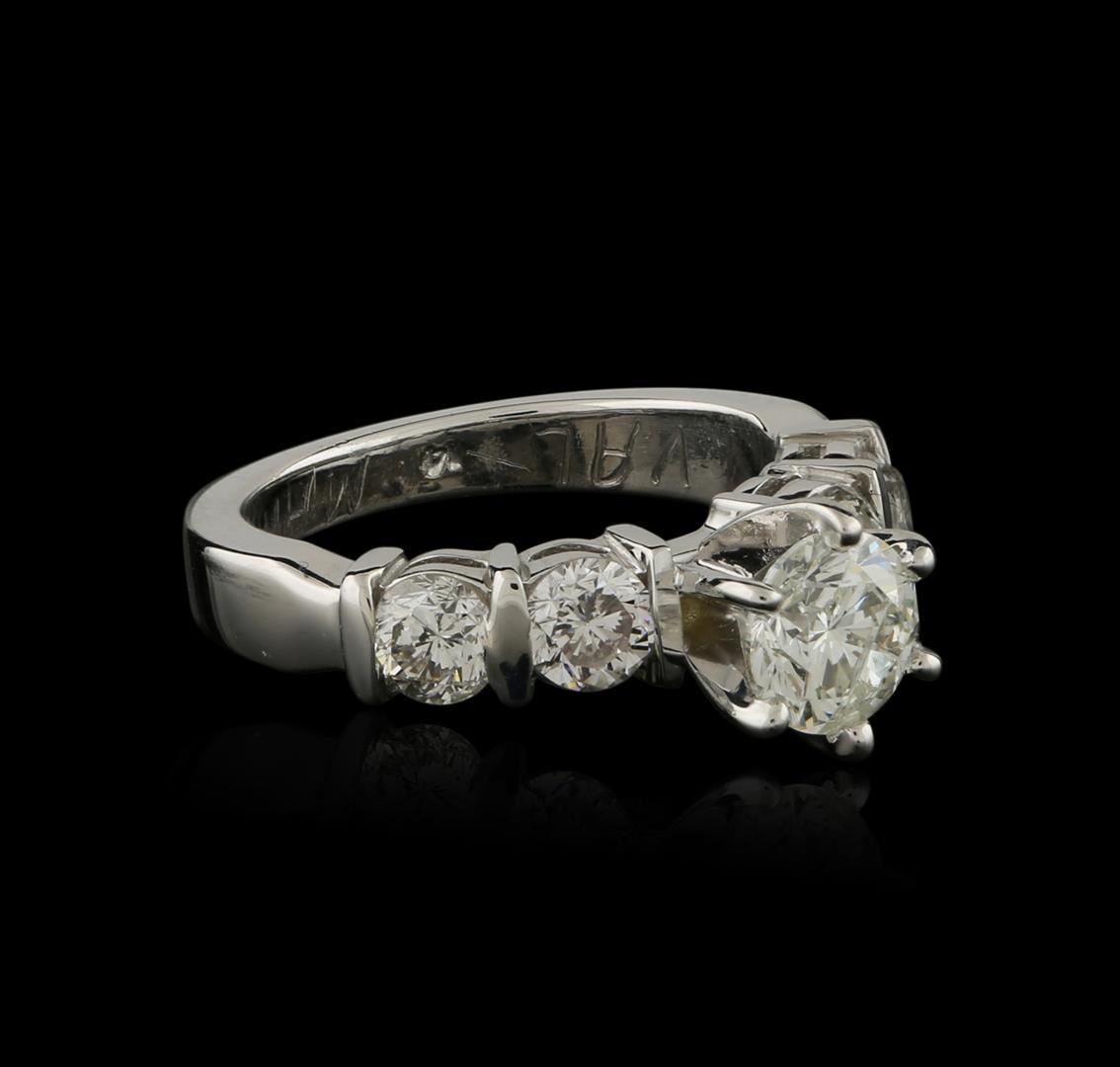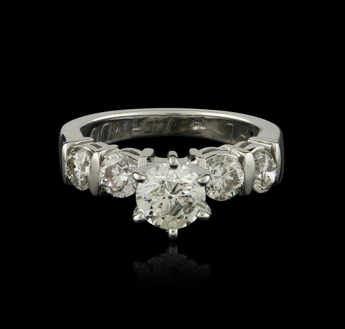 One electronically tested 14KT white gold ladies cast diamond engagement ring with a bright polish finish. Identified with markings of "14K". Condition is very good. Containing: One prong set round brilliant cut diamond, measuring 5.80 - 5.80 x 3.48mm (depth est.) approximate weight of 0.71ct. Clarity: I-2. Color: J, Cut is Good. Four prong set round brilliant cut diamonds, measuring 3.70 - 3.70 x 2.22mm (depth est.) approximate total weight of 4 Stones = 0.74ct. Clarity: SI-1 to SI-2. Color: I - J, Cut is Good. All diamonds are graded in the mounting, unless otherwise stated. Total Weight of Diamonds 1.46ct. Total Weight of Engagement Ring 4.80 grams. GGL Appraised at $5,530.00.