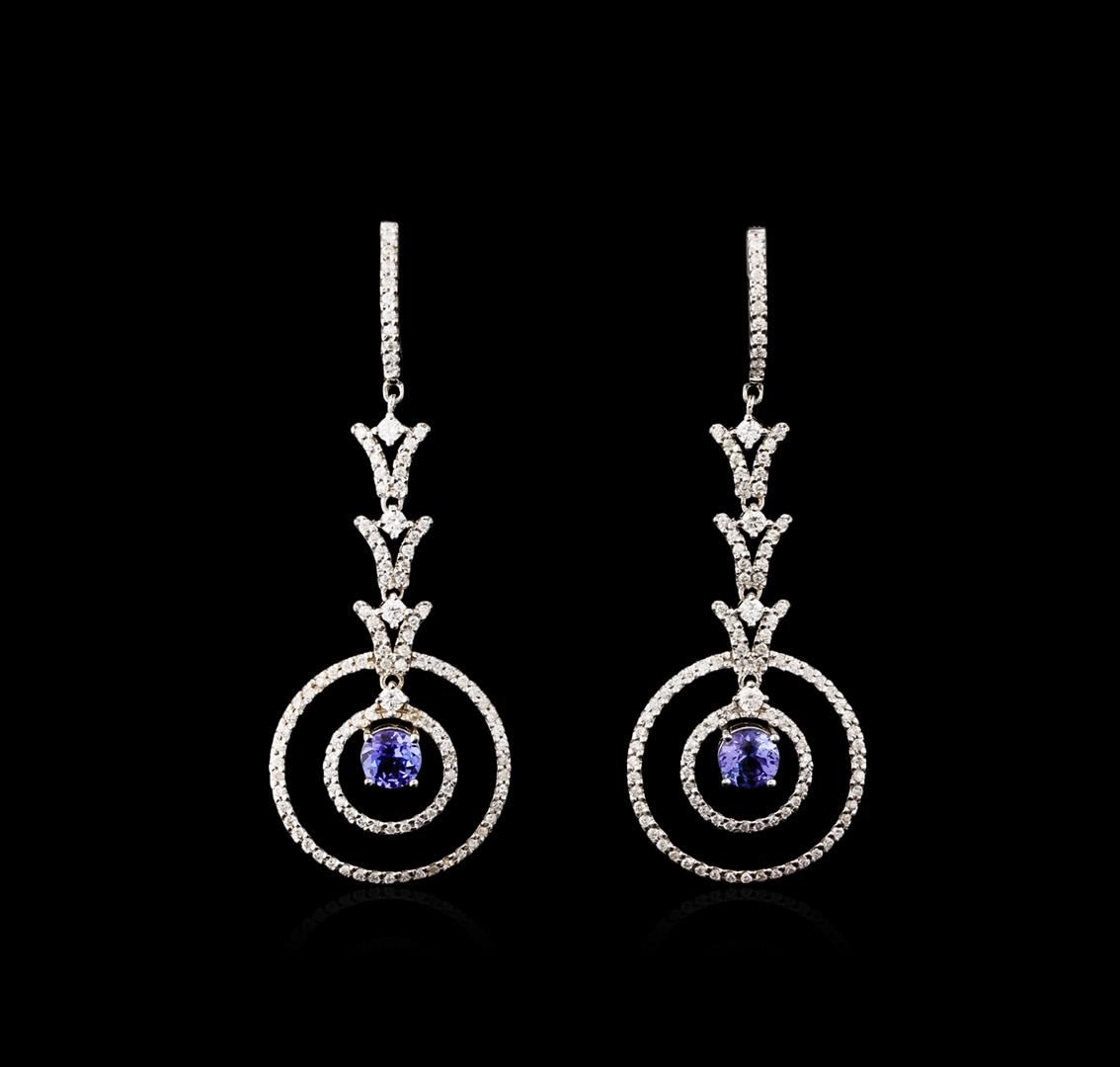 One pair electronically tested 14KT white gold ladies cast tanzanite and diamond earrings with hinged clip backs with a bright polish finish. Identified with markings of "14K". Condition is new. Containing: Two prong set round modified brilliant cut natural tanzanites, measuring 5.50 - 5.50 x 3.58 mm, approximate total weight of 1.46ct., clarity is eye clean, type I, medium light, very slightly grayish, violet color, (GIA V 4/3), cut is good. Two Hundred Ten prong set round brilliant cut diamonds, measuring 1.30 - 1.30 x 0.78mm (depth est.) approximate total weight of 210 Stones = 1.68ct. Clarity of I-1 to I-2, Color of I - J, Cut is Good. Eight prong set round brilliant cut diamonds, measuring 2.30 - 2.30 x 1.38mm (depth est.) approximate total weight of 8 Stones = 0.36ct. Clarity of SI-1 to I-1, Color of I - J, Cut is Good. Colored gemstones are presumed to have been subjected to commonly used enhancement processes. All diamonds and colored gemstones are graded in the mounting, unless otherwise stated. Total Weight of Colored Stones 1.46ct. Total Weight of Diamonds 2.04ct. Total Weight of Earrings 12.10 grams. GGL Appraised at $5,200.00.