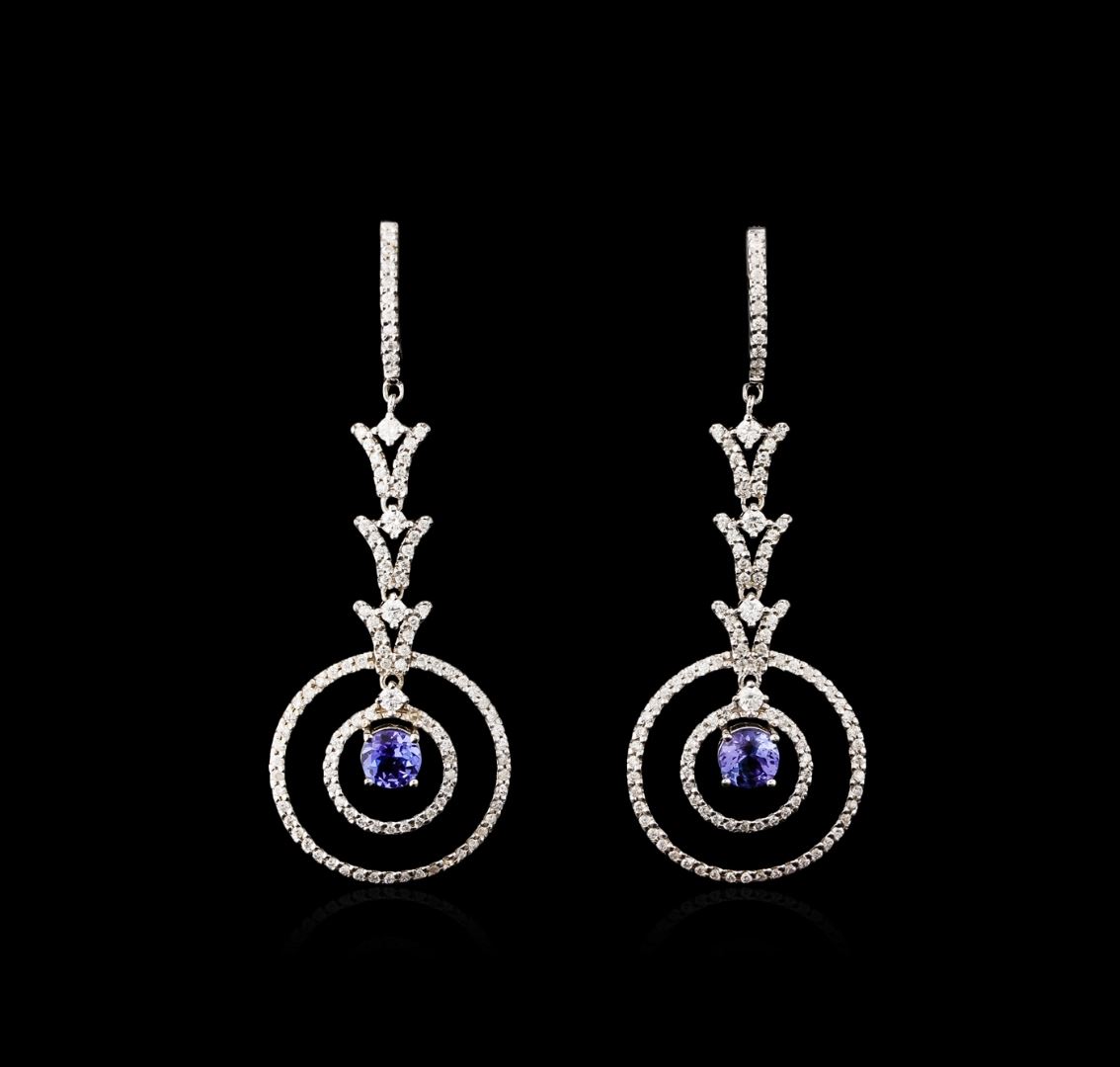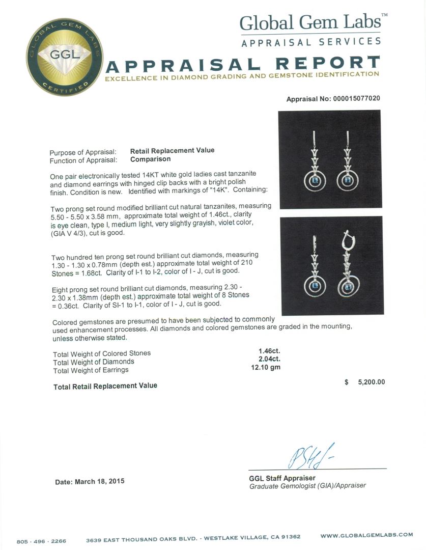 One pair electronically tested 14KT white gold ladies cast tanzanite and diamond earrings with hinged clip backs with a bright polish finish. Identified with markings of "14K". Condition is new. Containing: Two prong set round modified brilliant cut natural tanzanites, measuring 5.50 - 5.50 x 3.58 mm, approximate total weight of 1.46ct., clarity is eye clean, type I, medium light, very slightly grayish, violet color, (GIA V 4/3), cut is good. Two Hundred Ten prong set round brilliant cut diamonds, measuring 1.30 - 1.30 x 0.78mm (depth est.) approximate total weight of 210 Stones = 1.68ct. Clarity of I-1 to I-2, Color of I - J, Cut is Good. Eight prong set round brilliant cut diamonds, measuring 2.30 - 2.30 x 1.38mm (depth est.) approximate total weight of 8 Stones = 0.36ct. Clarity of SI-1 to I-1, Color of I - J, Cut is Good. Colored gemstones are presumed to have been subjected to commonly used enhancement processes. All diamonds and colored gemstones are graded in the mounting, unless otherwise stated. Total Weight of Colored Stones 1.46ct. Total Weight of Diamonds 2.04ct. Total Weight of Earrings 12.10 grams. GGL Appraised at $5,200.00.