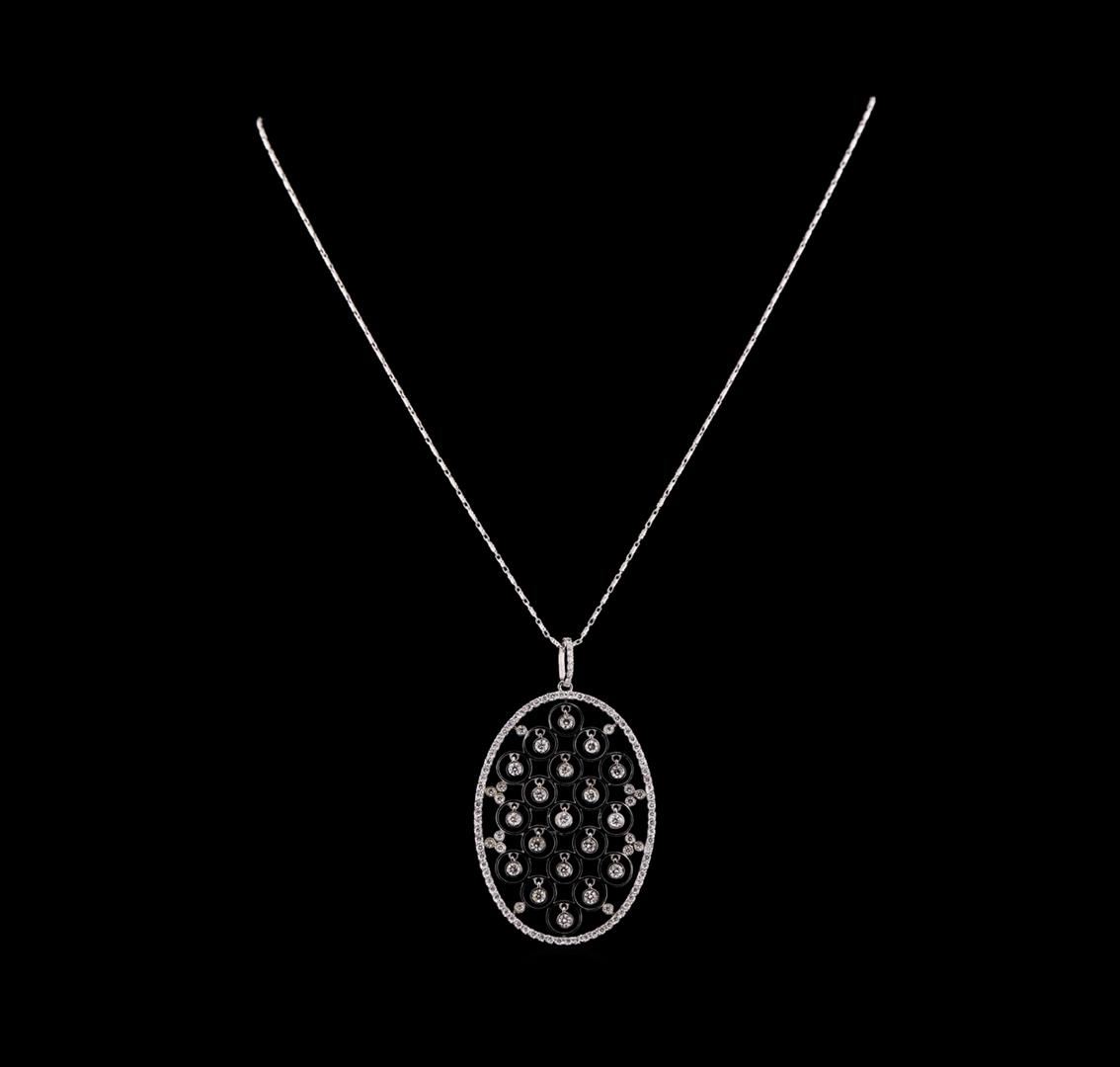 One electronically tested 14KT white gold ladies combination cast & assembled diamond pendant & chain 18.0" long, cable link with a lobster claw clasp with a bright polish finish. Identified with markings of "585". Condition is new. Containing: Nineteen bezel set round brilliant cut diamonds, measuring 2.50 - 2.50 x 1.50mm (depth est.) approximate total weight of 19 Stones = 1.09ct. Clarity: SI-2 to I-1. Color: I - J, Cut is Good. Eighty prong set round brilliant cut diamonds, measuring 1.10 - 1.10 x 0.66mm (depth est.) approximate total weight of 80 Stones = 0.38ct. Clarity: SI-2 to I-1. Color: I - J, Cut is Good. All diamonds are graded in the mounting, unless otherwise stated. Total Weight of Diamonds 1.47ct. Total Weight of Pendant & Chain 11.60 grams. GGL Appraised at $7,325.00.