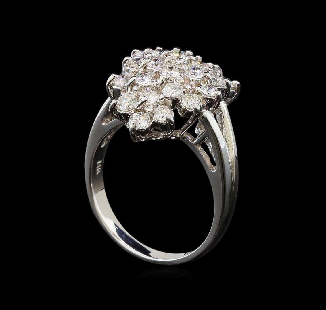 One electronically tested 14KT white gold ladies cast diamond ring with a bright polish finish. Identified with markings of "14K". Condition is new. Containing: Twenty-Seven prong set round brilliant cut diamonds, measuring 2.90 - 2.80 x 1.71mm (depth est.) approximate total weight of 27 Stones = 1.47ct. Clarity: SI-1 to SI-2. Color: G - H, Cut is Very Good. All diamonds are graded in the mounting, unless otherwise stated. Total Weight of Diamonds 1.47ct. Total Weight of Ring 6.20 grams. GGL Appraised at $4,130.00.