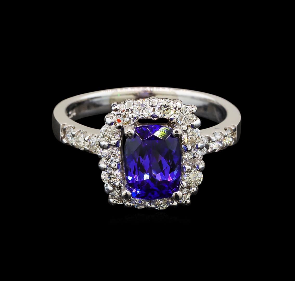 One electronically tested 14KT white gold ladies cast tanzanite and diamond ring with a bright polish finish. Identified with markings of "14K". Condition is new. Containing: One prong set rectangular cushion modified brilliant cut natural tanzanite, measuring 8.00 x 6.00 x 3.90mm, approximate weight of 1.47ct., clarity is eye clean, type I, medium, moderately strong, bluish violet color, (GIA bV 5/4), cut is good. Twenty prong set round brilliant cut diamonds, measuring 2.00 - 1.90 x 1.17mm (depth est.) approximate total weight of 20 Stones = 0.54ct. Clarity: SI-1 to I-1. Color: I - J, Cut is Good. Colored gemstones are presumed to have been subjected to commonly used enhancement processes. All diamonds and colored gemstones are graded in the mounting, unless otherwise stated. Total Weight of Colored Stones 1.47ct. Total Weight of Diamonds 0.54ct. Total Weight of Ring 4.80 grams. GGL Appraised at $3,020.00.