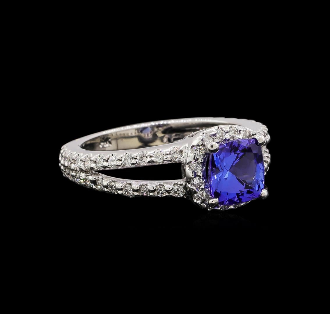 One electronically tested 14KT white gold ladies cast tanzanite and diamond ring with a bright polish finish. Identified with markings of "14KT". Condition is new. Containing: One prong set square cushion modified brilliant cut natural tanzanite, measuring 6.60 x 6.60 x 4.29mm, approximate weight of 1.47ct., clarity is eye clean, type I, medium light, very slightly grayish, violet color, (GIA V 4/3), cut is very good. Sixty-Two prong set round brilliant cut diamonds, measuring 1.30 - 1.30 x 0.78mm (depth est.) approximate total weight of 62 Stones = 0.50ct. Clarity: SI-1 to SI-2. Color: I - J, Cut is Good. Colored gemstones are presumed to have been subjected to commonly used enhancement processes. All diamonds and colored gemstones are graded in the mounting, unless otherwise stated. Total Weight of Colored Stones 1.47ct. Total Weight of Diamonds 0.50ct. Total Weight of Ring 4.60 grams. GGL Appraised.