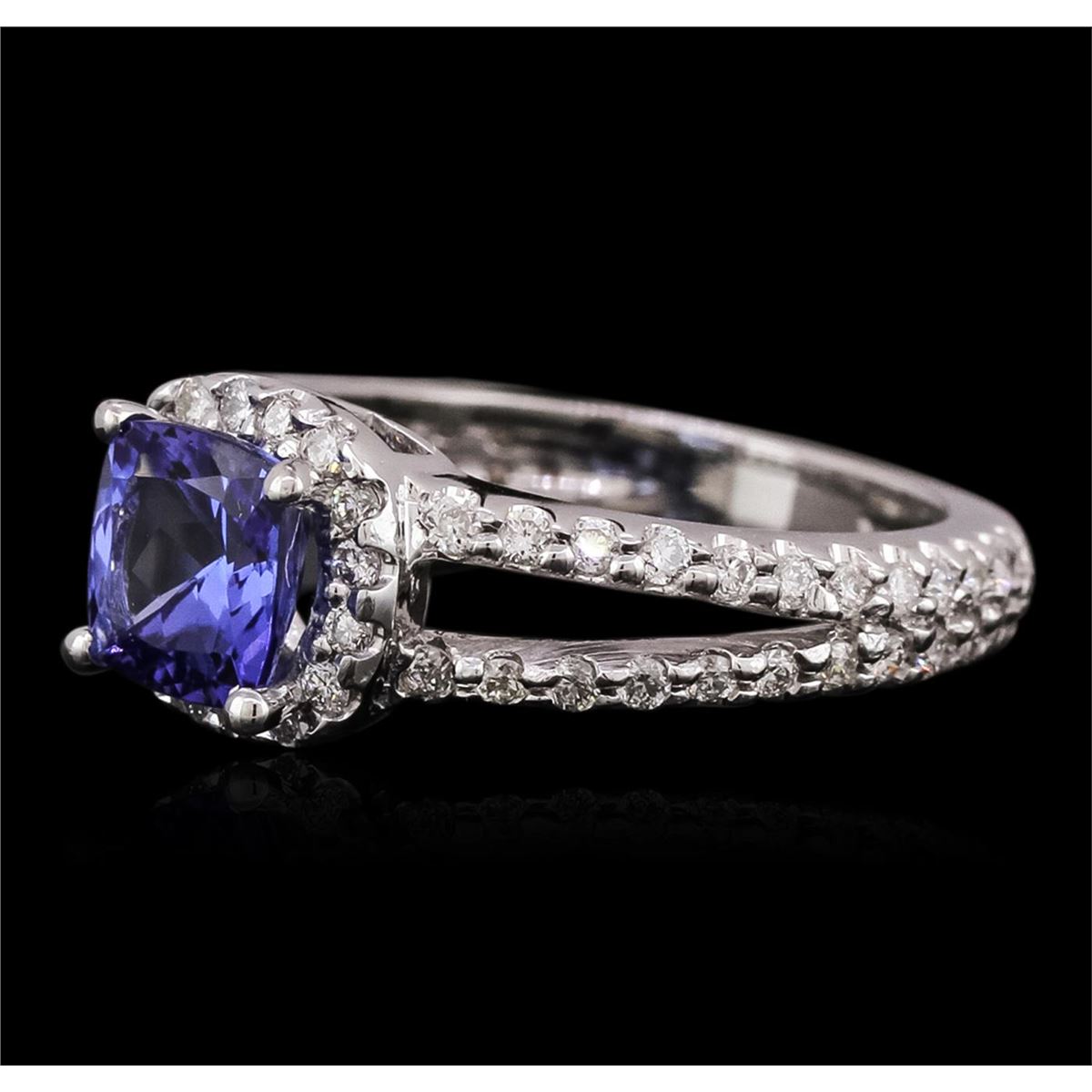 One electronically tested 14KT white gold ladies cast tanzanite and diamond ring with a bright polish finish. Identified with markings of "14KT". Condition is new. Containing: One prong set square cushion modified brilliant cut natural tanzanite, measuring 6.60 x 6.60 x 4.29mm, approximate weight of 1.47ct., clarity is eye clean, type I, medium light, very slightly grayish, violet color, (GIA V 4/3), cut is very good. Sixty-Two prong set round brilliant cut diamonds, measuring 1.30 - 1.30 x 0.78mm (depth est.) approximate total weight of 62 Stones = 0.50ct. Clarity: SI-1 to SI-2. Color: I - J, Cut is Good. Colored gemstones are presumed to have been subjected to commonly used enhancement processes. All diamonds and colored gemstones are graded in the mounting, unless otherwise stated. Total Weight of Colored Stones 1.47ct. Total Weight of Diamonds 0.50ct. Total Weight of Ring 4.60 grams. GGL Appraised at $3,505.00.