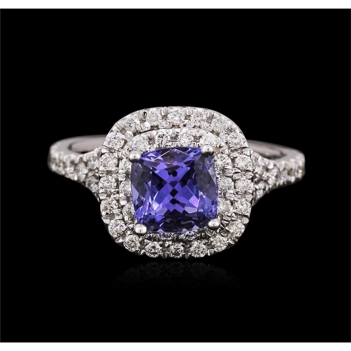 One electronically tested 14KT white gold ladies cast tanzanite and diamond ring with a bright polish finish. Identified with markings of "14KT". Condition is new. Containing: One prong set square cushion modified brilliant cut natural tanzanite, measuring 6.60 x 6.60 x 4.29mm, approximate weight of 1.47ct., clarity is eye clean, type I, medium light, very slightly grayish, violet color, (GIA V 4/3), cut is very good. Sixty prong set round brilliant cut diamonds, measuring 1.50 - 1.50 x 0.90mm (depth est.) approximate total weight of 60 Stones = 0.74ct. Clarity: SI-1 to I-1. Color: I - J, Cut is Good. Colored gemstones are presumed to have been subjected to commonly used enhancement processes. All diamonds and colored gemstones are graded in the mounting, unless otherwise stated. Total Weight of Colored Stones 1.47ct. Total Weight of Diamonds 0.74ct. Total Weight of Ring 5.30 grams. GGL Appraised at $4,010.00.