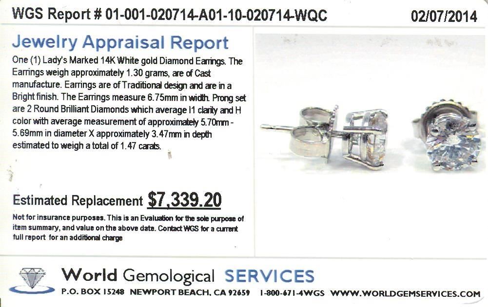 One (1) Ladies Marked 14KT White Gold Diamond Earrings. The Earrings weigh approximately 1.30 grams, are of Cast manufacture. Earrings are of a Traditional design and are in a Bright finish. The Earrings measure 6.75mm in width. Prong set are 2 Round Brilliant Diamonds which average I1 clarity and H color with average measurement of approximately 5.70mm-5.69mm in diameter X approximately 3.47mm in depth estimated to weigh a total of 1.47 carats. WGS Appraised at $7,339.20.