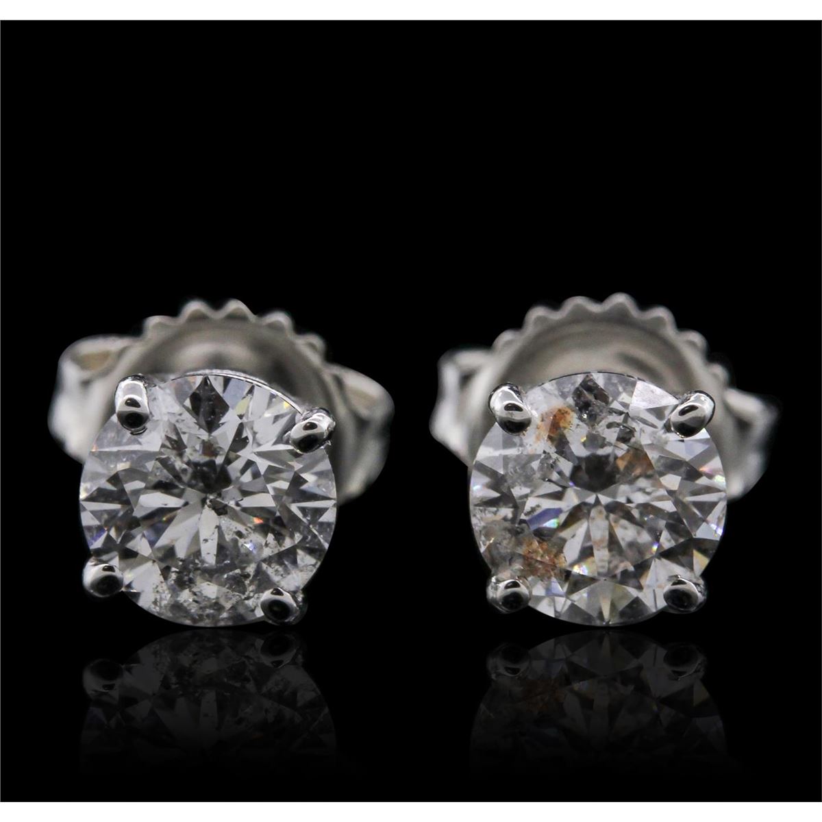 One (1) Ladies Marked 14KT White Gold Diamond Earrings. The Earrings weigh approximately 1.30 grams, are of Cast manufacture. Earrings are of a Traditional design and are in a Bright finish. The Earrings measure 6.75mm in width. Prong set are 2 Round Brilliant Diamonds which average I1 clarity and H color with average measurement of approximately 5.70mm-5.69mm in diameter X approximately 3.47mm in depth estimated to weigh a total of 1.47 carats. WGS Appraised at $7,339.20.