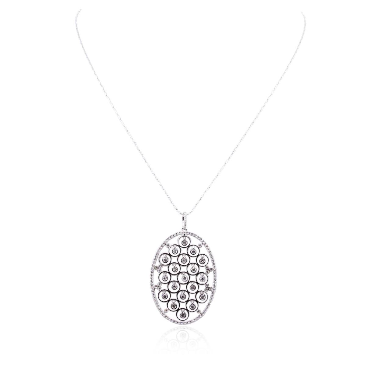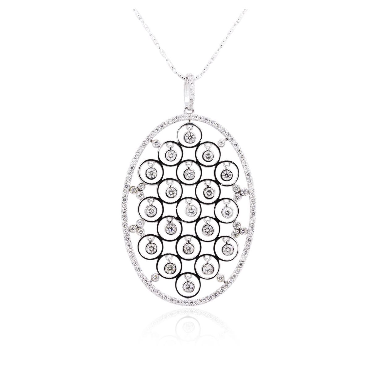 One electronically tested 14KT white gold ladies combination cast & assembled diamond pendant & chain 18.0" long, cable link with a lobster claw clasp with a bright polish finish. Identified with markings of "585". Condition is new. Containing: Nineteen bezel set round brilliant cut diamonds, measuring 2.50 - 2.50 x 1.50mm (depth est.) approximate total weight of 19 Stones = 1.09ct. Clarity: SI-2 to I-1. Color: I - J, Cut is Good. Eighty prong set round brilliant cut diamonds, measuring 1.10 - 1.10 x 0.66mm (depth est.) approximate total weight of 80 Stones = 0.38ct. Clarity: SI-2 to I-1. Color: I - J, Cut is Good. All diamonds are graded in the mounting, unless otherwise stated. Total Weight of Diamonds 1.47ct. Total Weight of Pendant & Chain 11.60 grams. GGL Appraised at $7,325.00.