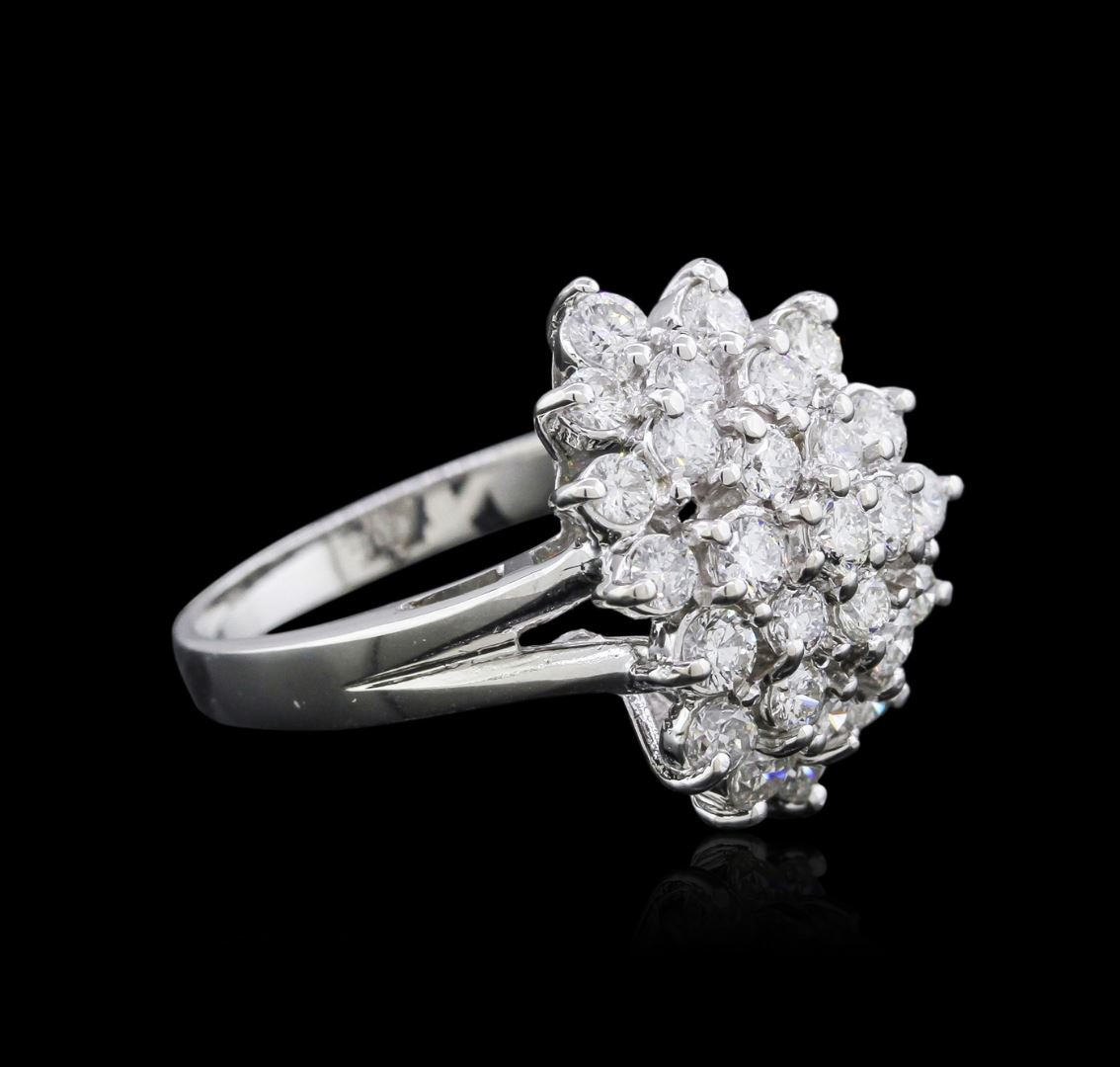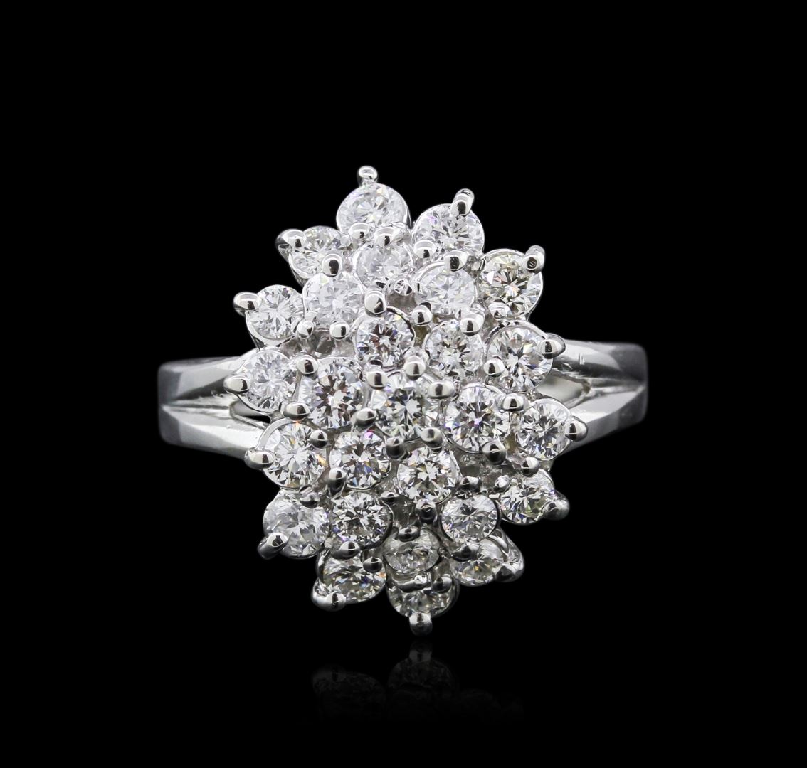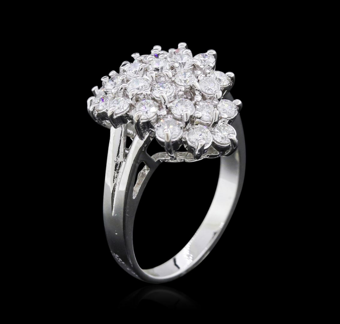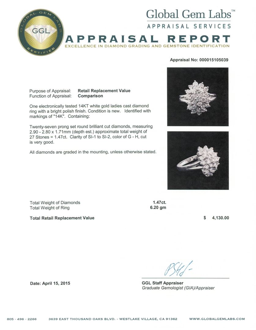 One electronically tested 14KT white gold ladies cast diamond ring with a bright polish finish. Identified with markings of "14K". Condition is new. Containing: Twenty-Seven prong set round brilliant cut diamonds, measuring 2.90 - 2.80 x 1.71mm (depth est.) approximate total weight of 27 Stones = 1.47ct. Clarity: SI-1 to SI-2. Color: G - H, Cut is Very Good. All diamonds are graded in the mounting, unless otherwise stated. Total Weight of Diamonds 1.47ct. Total Weight of Ring 6.20 grams. GGL Appraised at $4,130.00.
