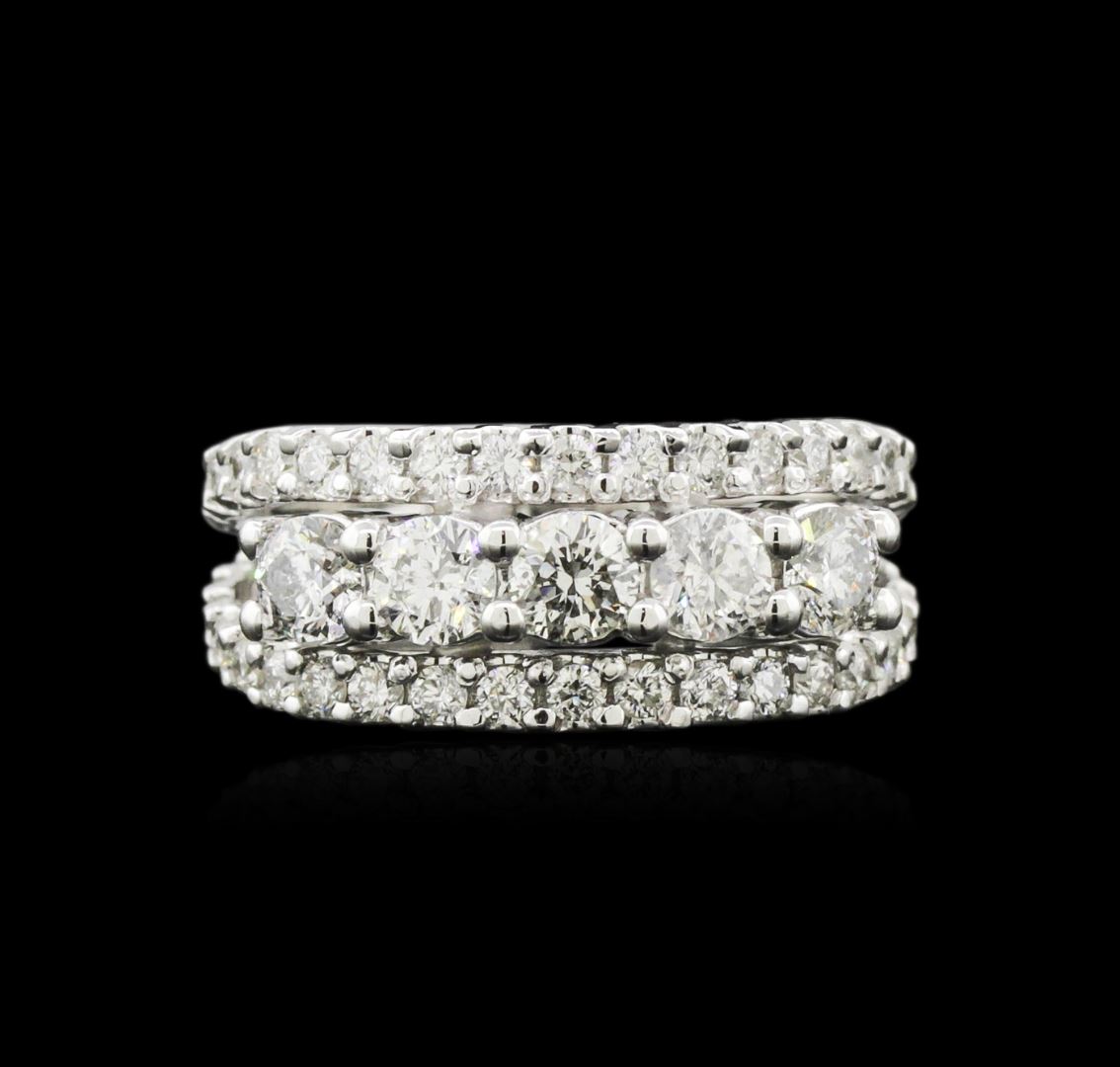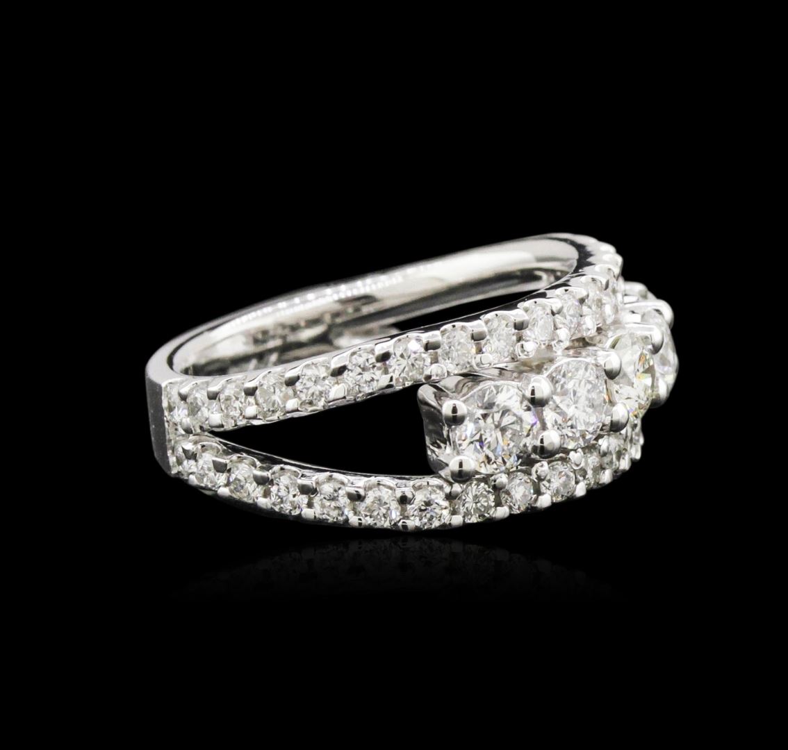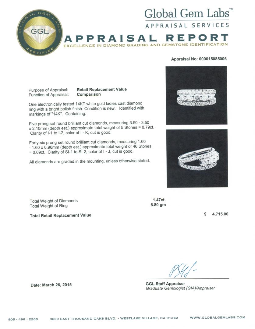 One electronically tested 14KT white gold ladies cast diamond ring with a bright polish finish. Identified with markings of "14K". Condition is new. Containing: Five prong set round brilliant cut diamonds, measuring 3.50 - 3.50 x 2.10mm (depth est.) approximate total weight of 5 Stones = 0.79ct. Clarity: I-1 to I-2. Color: I - K, Cut is Good. Forty-Six prong set round brilliant cut diamonds, measuring 1.60 - 1.60 x 0.96mm (depth est.) approximate total weight of 46 Stones = 0.69ct. Clarity: SI-1 to SI-2. Color: I - J, Cut is Good. All diamonds are graded in the mounting, unless otherwise stated. Total Weight of Diamonds 1.47ct. Total Weight of Ring 6.80 grams. GGL Appraised at $4,715.00.