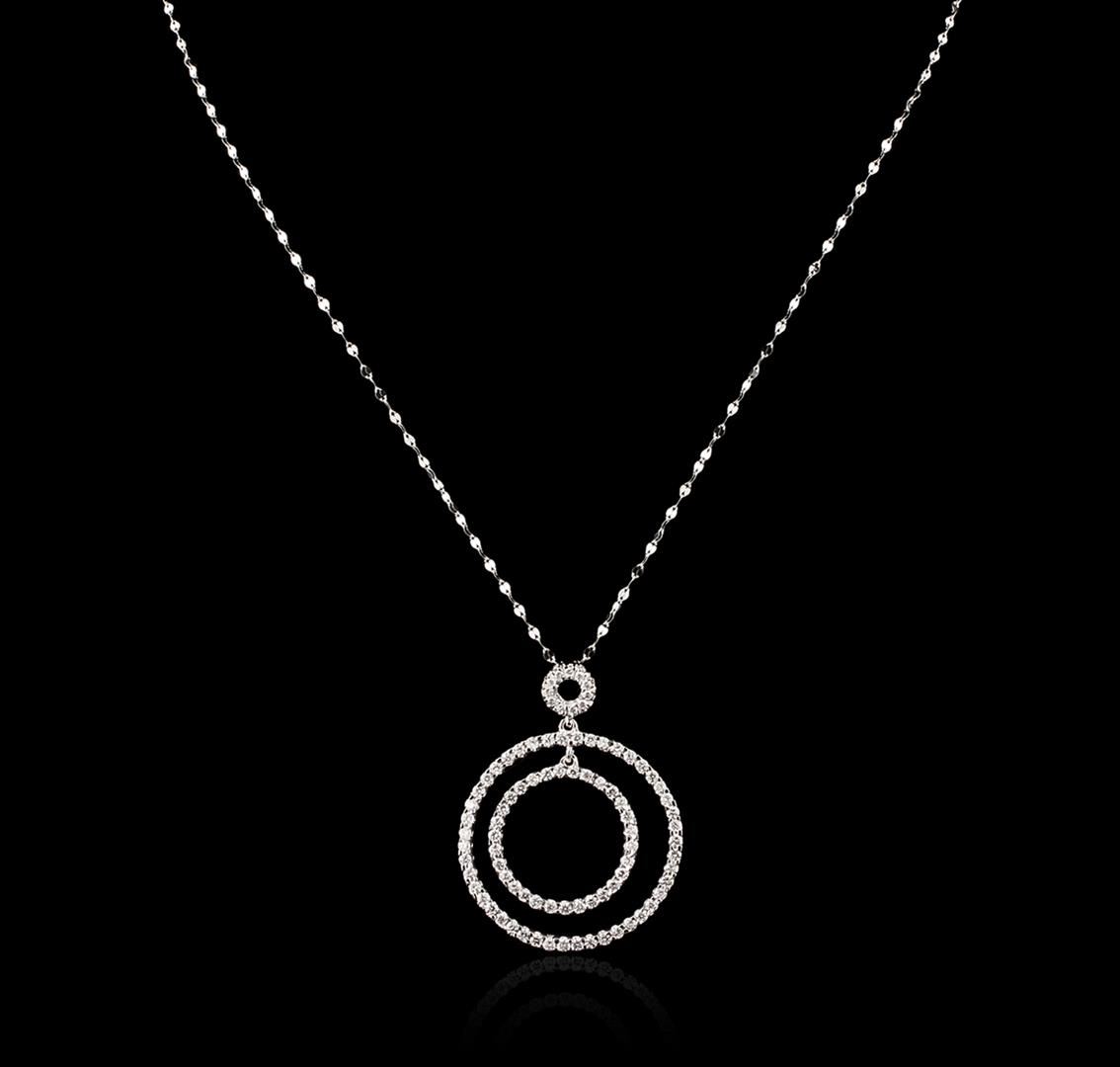 One electronically tested 14KT white gold ladies cast diamond pendant & chain 18.0" long, with a spring ring clasp with a bright polish finish. Identified with markings of "14K". Condition is new. Containing: Ninety prong set round brilliant cut diamonds, measuring 1.80 - 1.50 x 0.99mm (depth est.) approximate total weight of 90 Stones = 1.48ct. Clarity: SI-2 to I-1. Color: H - I, Cut is Good. All diamonds are graded in the mounting, unless otherwise stated. Total Weight of Diamonds 1.48ct. Total Weight of Pendant & Chain 6.50 grams. GGL Appraised at $3,970.00.