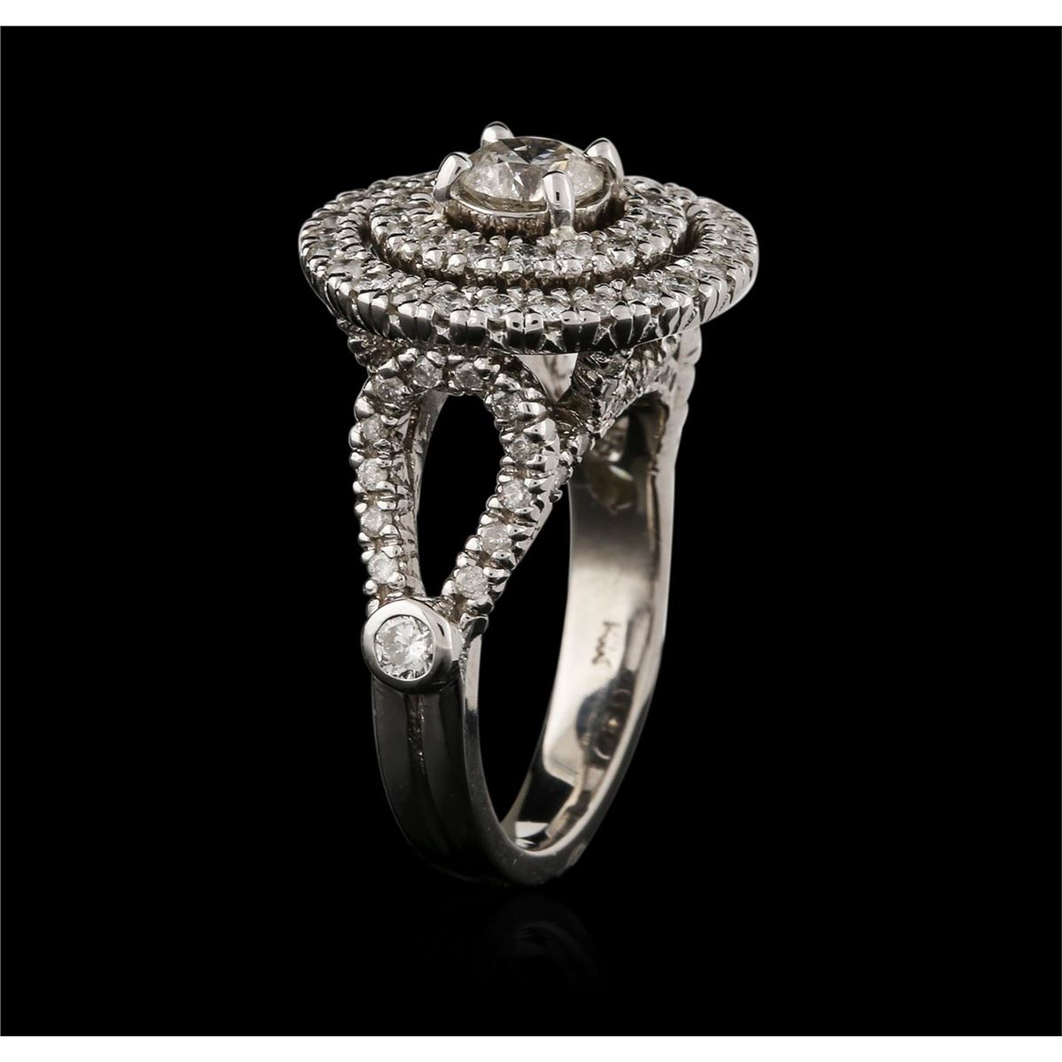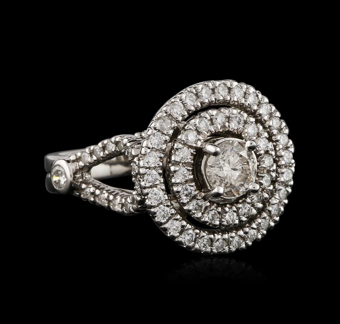 One electronically tested 14KT white gold ladies cast diamond engagement ring with a bright polish finish. Identified with markings of "14K". Condition is new. Containing: One prong set round brilliant cut diamond, measuring 5.10 - 5.07 x 3.05mm (depth est.) approximate weight of 0.48ct. Clarity: I-2. Color: K, Cut is Good. Ninety-Four prong set round brilliant cut diamonds, measuring 2.00 - 1.10 x 0.93mm (depth est.) approximate total weight of 94 Stones = 1.00ct. Clarity: SI-1 to I-1. Color: I - J. All diamonds are graded in the mounting, unless otherwise stated. Total Weight of Diamonds 1.48ct. Total Weight of Engagement Ring 8.50 grams. GGL Appraised at $6,280.00.