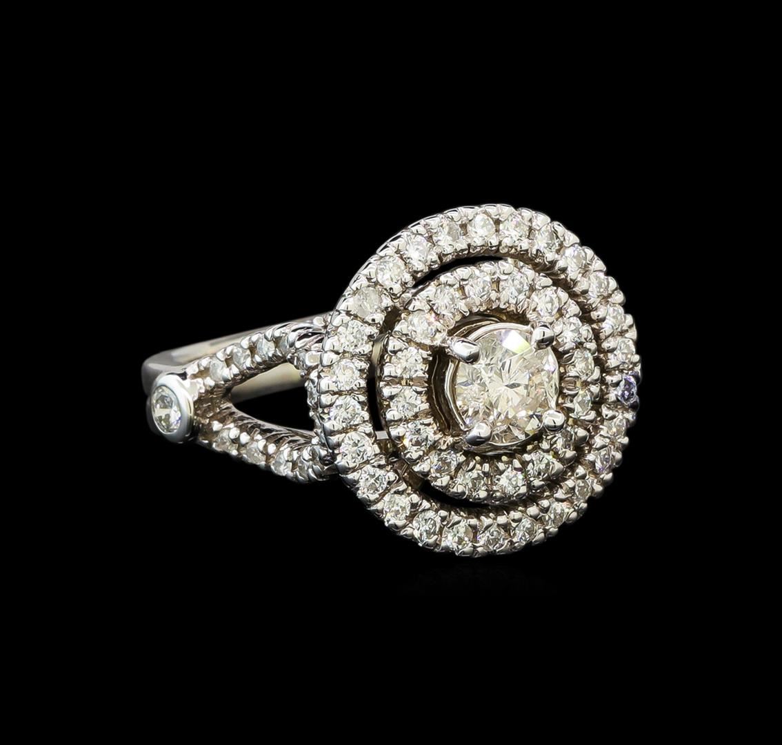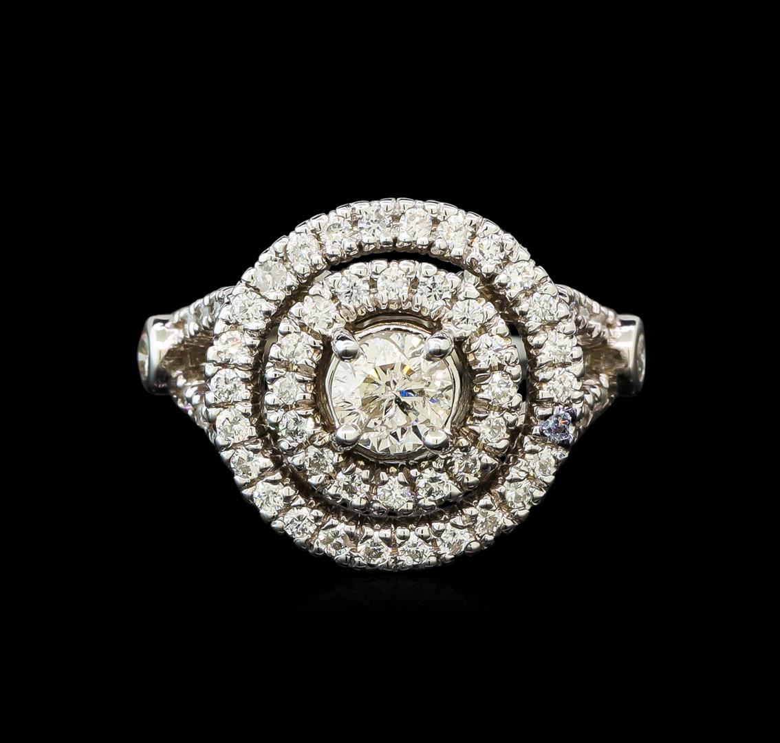 One electronically tested 14KT white gold ladies cast diamond engagement ring with a bright polish finish. Identified with markings of "14K". Condition is new. Containing: One prong set round brilliant cut diamond, measuring 5.10 - 5.07 x 3.05mm (depth est.) approximate weight of 0.48ct. Clarity: I-2. Color: K, Cut is Good. Ninety-Four prong set round brilliant cut diamonds, measuring 2.00 - 1.10 x 0.93mm (depth est.) approximate total weight of 94 Stones = 1.00ct. Clarity: SI-1 to I-1. Color: I - J. All diamonds are graded in the mounting, unless otherwise stated. Total Weight of Diamonds 1.48ct. Total Weight of Engagement Ring 8.50 grams. GGL Appraised at $6,280.00.