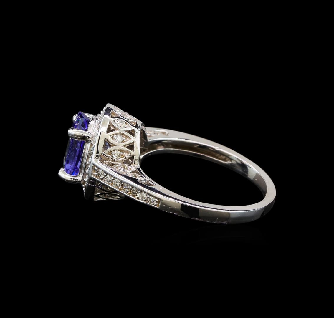 One electronically tested 14KT white gold ladies cast tanzanite and diamond ring with a bright polish finish. Condition is new. Containing: One prong set oval modified brilliant cut natural tanzanite, measuring 9.00 x 6.00 x 3.90mm, approximate weight of 1.48ct., clarity is eye clean, type I, medium light, very slightly grayish, violet color, (GIA V 4/3), cut is good. Thirty-Six prong set round brilliant cut diamonds, measuring 1.30 - 1.30 x 0.78mm (depth est.) approximate total weight of 36 Stones = 0.29ct. Clarity: SI-2 to I-1. Color: I - J, Cut is Good. Colored gemstones are presumed to have been subjected to commonly used enhancement processes. All diamonds and colored gemstones are graded in the mounting, unless otherwise stated. Total Weight of Colored Stones 1.48ct. Total Weight of Diamonds 0.29ct. Total Weight of Ring 4.90 grams. GGL Appraised at $3,020.00.