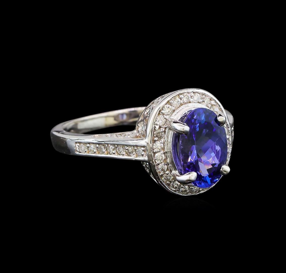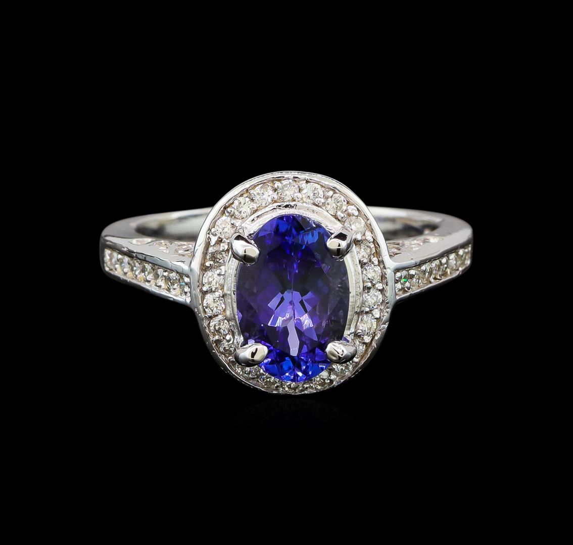 One electronically tested 14KT white gold ladies cast tanzanite and diamond ring with a bright polish finish. Condition is new. Containing: One prong set oval modified brilliant cut natural tanzanite, measuring 9.00 x 6.00 x 3.90mm, approximate weight of 1.48ct., clarity is eye clean, type I, medium light, very slightly grayish, violet color, (GIA V 4/3), cut is good. Thirty-Six prong set round brilliant cut diamonds, measuring 1.30 - 1.30 x 0.78mm (depth est.) approximate total weight of 36 Stones = 0.29ct. Clarity: SI-2 to I-1. Color: I - J, Cut is Good. Colored gemstones are presumed to have been subjected to commonly used enhancement processes. All diamonds and colored gemstones are graded in the mounting, unless otherwise stated. Total Weight of Colored Stones 1.48ct. Total Weight of Diamonds 0.29ct. Total Weight of Ring 4.90 grams. GGL Appraised at $3,020.00.
