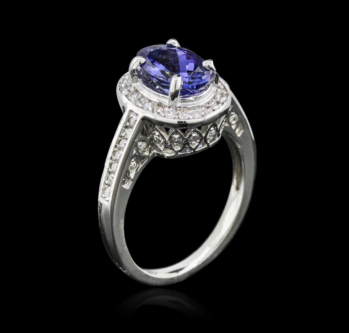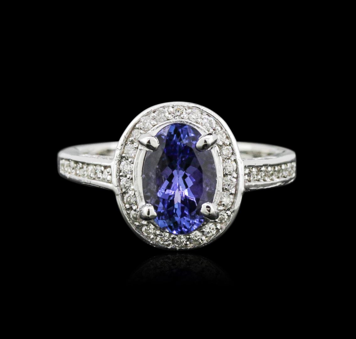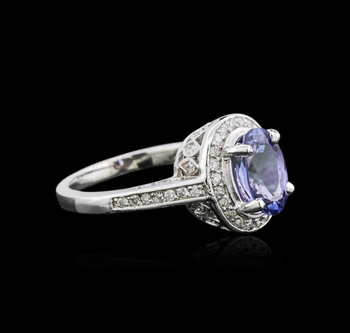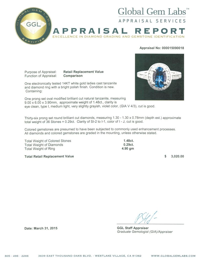 One electronically tested 14KT white gold ladies cast tanzanite and diamond ring with a bright polish finish. Condition is new. Containing: One prong set oval modified brilliant cut natural tanzanite, measuring 9.00 x 6.00 x 3.90mm, approximate weight of 1.48ct., clarity is eye clean, type I, medium light, very slightly grayish, violet color, (GIA V 4/3), cut is good. Thirty-Six prong set round brilliant cut diamonds, measuring 1.30 - 1.30 x 0.78mm (depth est.) approximate total weight of 36 Stones = 0.29ct. Clarity: SI-2 to I-1. Color: I - J, Cut is Good. Colored gemstones are presumed to have been subjected to commonly used enhancement processes. All diamonds and colored gemstones are graded in the mounting, unless otherwise stated. Total Weight of Colored Stones 1.48ct. Total Weight of Diamonds 0.29ct. Total Weight of Ring 4.90 grams. GGL Appraised at $3,020.00.