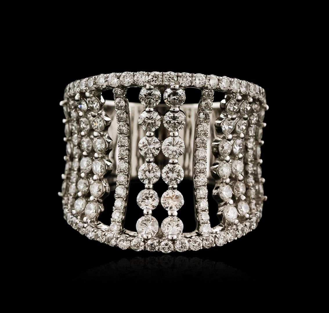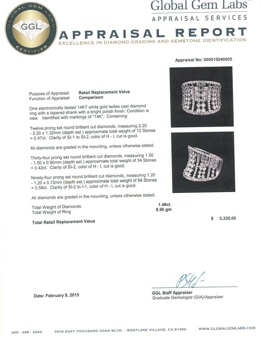 One electronically tested 14KT white gold ladies cast diamond ring with a tapered shank with a bright polish finish. Identified with markings of "14K". Condition is new. Containing: Twelve prong set round brilliant cut diamonds, measuring 2.20 - 2.20 x 1.32mm (depth est.) approximate total weight of 12 Stones = 0.47ct. Clarity: SI-1 to SI-2. Color: H - I, Cut is Good. Thirty-Four prong set round brilliant cut diamonds, measuring 1.50 - 1.50 x 0.90mm (depth est.) approximate total weight of 34 Stones = 0.42ct. Clarity: SI-2. Color: H - I, Cut is Good. Ninety-Four prong set round brilliant cut diamonds, measuring 1.20 - 1.20 x 0.72mm (depth est.) approximate total weight of 94 Stones = 0.59ct. Clarity: SI-2 to I-1. Color: H - I, Cut is Good. All diamonds are graded in the mounting, unless otherwise stated. Total Weight of Diamonds 1.48ct. Total Weight of Ring 6.90 grams. GGL Appraised at $5,335.00.