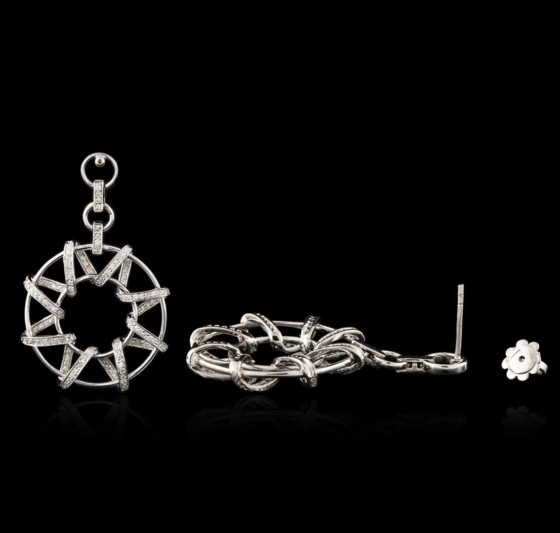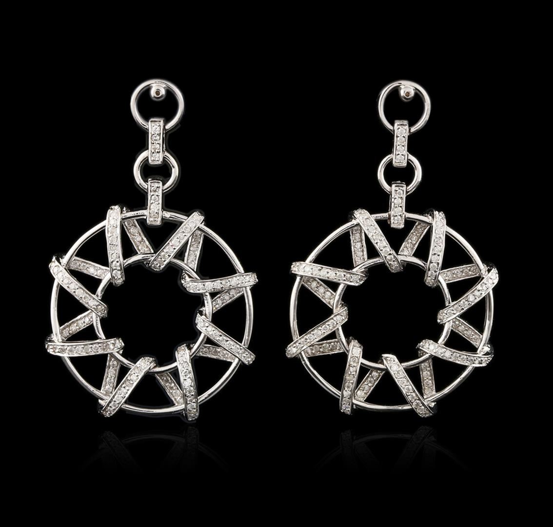 One pair electronically tested 14KT white gold ladies cast & assembled diamond dangle earrings with standard backs. Each earring features a dangle consisting of two white gold circles with intertwining diamond ribbons. Bright polish finish. Condition is new, good workmanship. Containing: Two Hundred Fifty-Four bead set round brilliant and single cut cut diamonds, measuring 1.20 x 1.10 x 0.69mm (depth est.) approximate total weight of 254 Stones = 1.49ct. Graded in the setting. Clarity: I-2 to I-3. Color: H - J. Total Weight of Diamonds 1.49ct. Total Weight of Earrings 15.47 grams. AIG Appraised at $6,055.00.