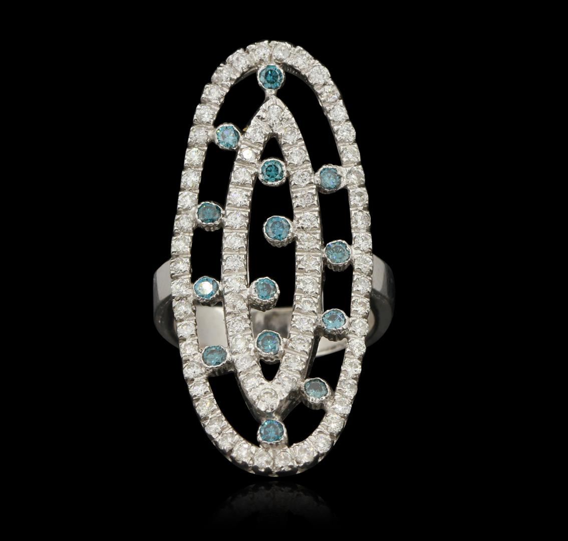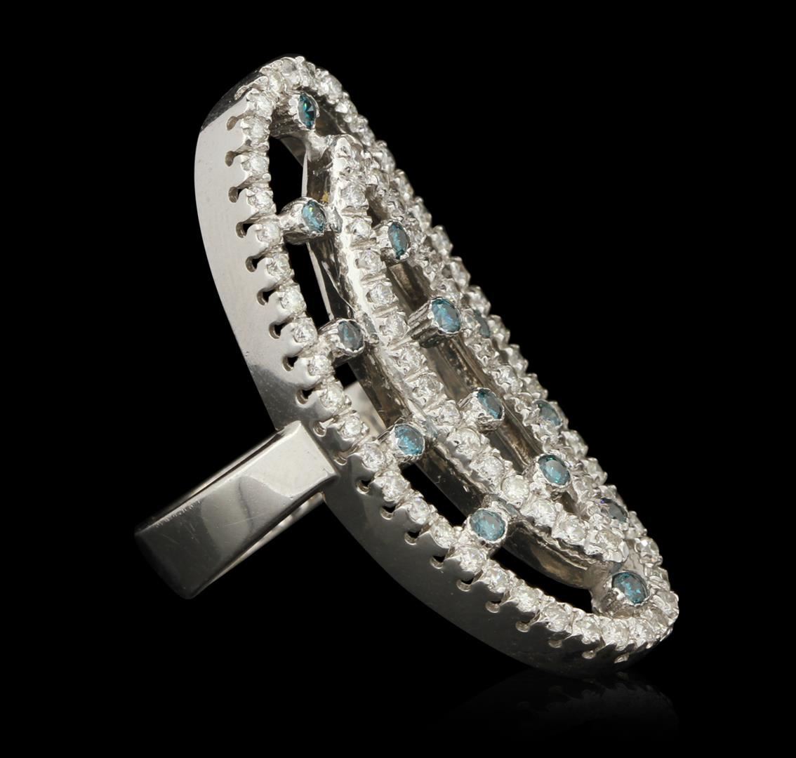 One electronically tested 14KT white gold ladies cast diamond ring with a bright polish finish. Condition is good. The ring features two diamond orbits interspersed with randomly placed diamonds, completed by a four and one-half millimeter wide band. Identified with markings of "K14". Containing: Fourteen bezel set round brilliant cut diamonds, measuring 1.90 - 1.80 x 1.11min (depth est.) approximate total weight of 14 Stones = 0.39ct. Indications of laboratory irradiated enhanced color. Graded in the setting. Clarity SI-1 to I-1. Color Fancy Very Slightly Greenish Blue Seventy-four prong set round brilliant cut diamonds, measuring 1.60 - 1.50 x 0.93mm (depth est.) approximate total weight of 74 Stones = 1.10ct. Graded in the setting. Clarity I-1 to I-2. Color G -- I. Total Weight of Diamonds 1.49ct. Total Weight of Ring 10.90gm. AIG Appraised at $5,700.00.