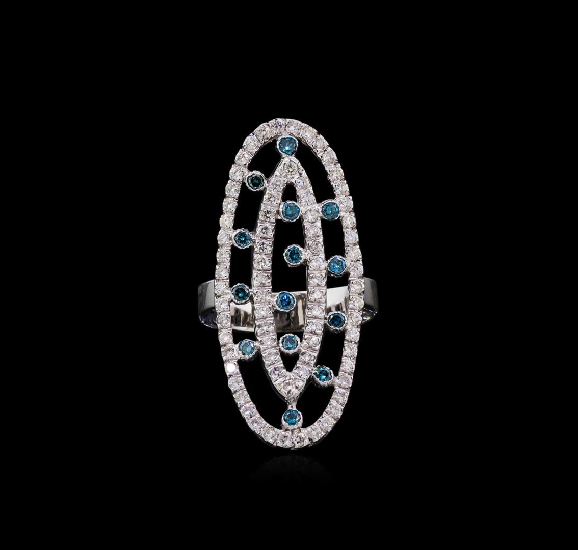 One electronically tested 14KT white gold ladies cast diamond ring with a bright polish finish. Condition is good. The ring features two diamond orbits interspersed with randomly placed diamonds, completed by a four and one-half millimeter wide band. Identified with markings of "K14". Containing: Fourteen bezel set round brilliant cut diamonds, measuring 1.90 - 1.80 x 1.11min (depth est.) approximate total weight of 14 Stones = 0.39ct. Indications of laboratory irradiated enhanced color. Graded in the setting. Clarity SI-1 to I-1. Color Fancy Very Slightly Greenish Blue Seventy-four prong set round brilliant cut diamonds, measuring 1.60 - 1.50 x 0.93mm (depth est.) approximate total weight of 74 Stones = 1.10ct. Graded in the setting. Clarity I-1 to I-2. Color G -- I. Total Weight of Diamonds 1.49ct. Total Weight of Ring 10.90gm. AIG Appraised at $5,700.00.