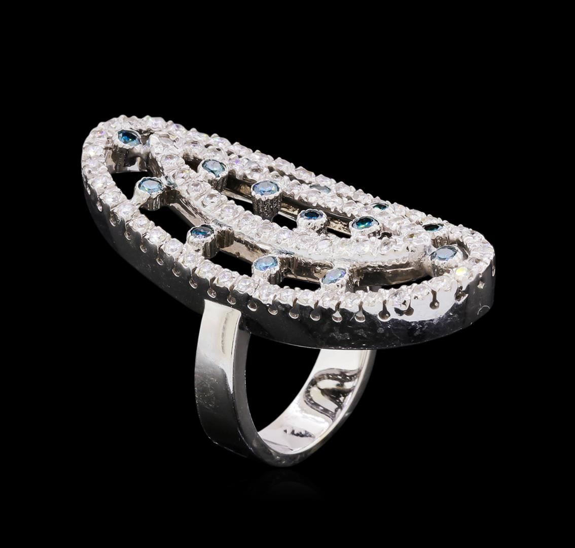 One electronically tested 14KT white gold ladies cast diamond ring with a bright polish finish. Condition is good. The ring features two diamond orbits interspersed with randomly placed diamonds, completed by a four and one-half millimeter wide band. Identified with markings of "K14". Containing: Fourteen bezel set round brilliant cut diamonds, measuring 1.90 - 1.80 x 1.11min (depth est.) approximate total weight of 14 Stones = 0.39ct. Indications of laboratory irradiated enhanced color. Graded in the setting. Clarity SI-1 to I-1. Color Fancy Very Slightly Greenish Blue Seventy-four prong set round brilliant cut diamonds, measuring 1.60 - 1.50 x 0.93mm (depth est.) approximate total weight of 74 Stones = 1.10ct. Graded in the setting. Clarity I-1 to I-2. Color G -- I. Total Weight of Diamonds 1.49ct. Total Weight of Ring 10.90gm. AIG Appraised at $5,700.00.