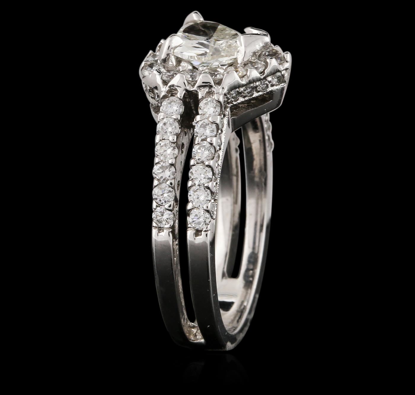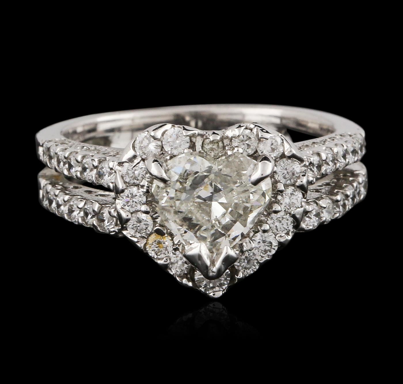 One ring featuring: 14KT white gold weighing 5.72 grams containing diamonds with a total weight of 1.49ct. Center Diamond: Weight: 1.00ct. Shape and cut: Heart Brilliant. Measurements: 7.27 x 6.77 x 3.32mm. Depth: 45.7%. Table: 64%. Crown: 10.0%. Pavilion: 32.0%. Girdle: Thin To Ex. Thick Faceted. Culet: None. Polish: Good. Symmetry: Good. Clarity Grade: SI3. Color Grade: H. Fluorescence: None. UGS Appraised.