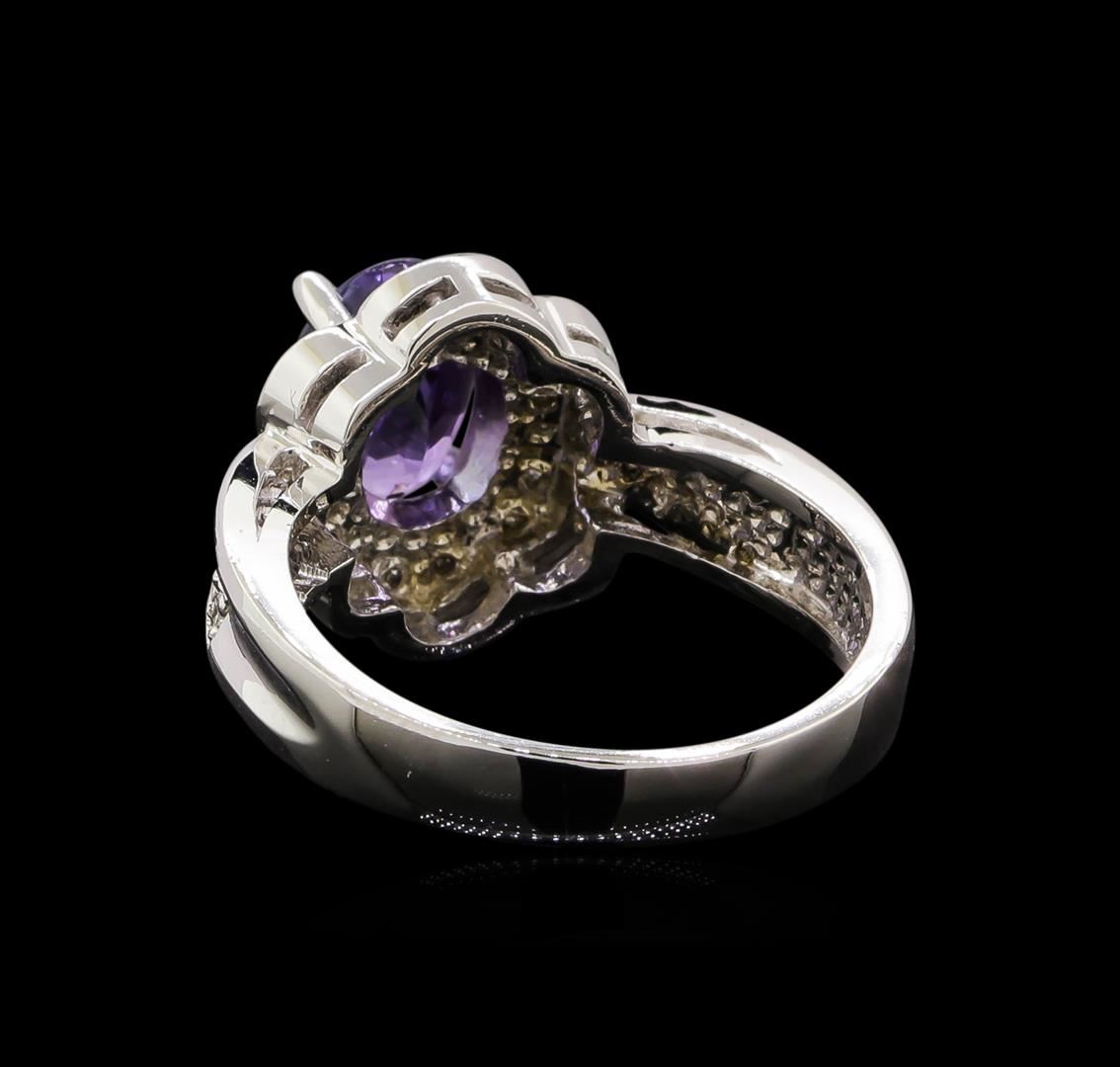 One electronically tested 14KT white gold ladies cast tanzanite and diamond ring with a bright polish finish. Identified with markings of "14K". Condition is new. Containing: One prong set oval modified brilliant cut natural tanzanite, measuring 8.50 x 6.20 x 4.03mm, approximate weight of 1.49ct., clarity is eye clean, type I, medium light, very slightly grayish, violet color, (GIA V 4/3), cut is good. Twenty-Six prong set round brilliant cut diamonds, measuring 1.50 - 1.50 x 0.90mm (depth est.) approximate total weight of 26 Stones = 0.32ct. Clarity: SI-1 to SI-2. Color: I - J, Cut is Good. Colored gemstones are presumed to have been subjected to commonly used enhancement processes. All diamonds and colored gemstones are graded in the mounting, unless otherwise stated. Total Weight of Colored Stones 1.49ct. Total Weight of Diamonds 0.32ct. Total Weight of Ring 6.00 grams. GGL Appraised at $3,210.00.