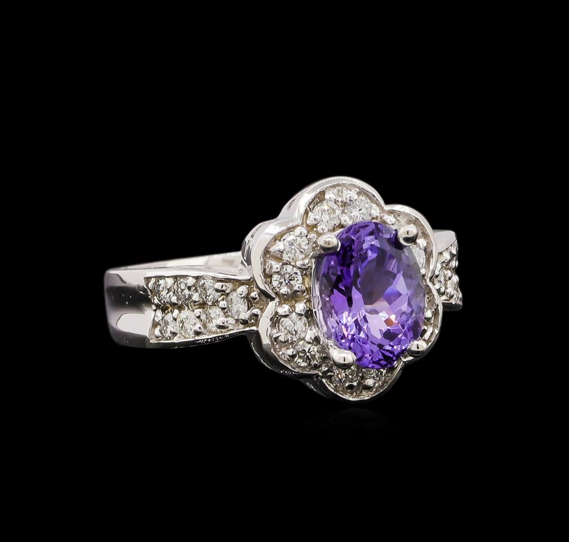 One electronically tested 14KT white gold ladies cast tanzanite and diamond ring with a bright polish finish. Identified with markings of "14K". Condition is new. Containing: One prong set oval modified brilliant cut natural tanzanite, measuring 8.50 x 6.20 x 4.03mm, approximate weight of 1.49ct., clarity is eye clean, type I, medium light, very slightly grayish, violet color, (GIA V 4/3), cut is good. Twenty-Six prong set round brilliant cut diamonds, measuring 1.50 - 1.50 x 0.90mm (depth est.) approximate total weight of 26 Stones = 0.32ct. Clarity: SI-1 to SI-2. Color: I - J, Cut is Good. Colored gemstones are presumed to have been subjected to commonly used enhancement processes. All diamonds and colored gemstones are graded in the mounting, unless otherwise stated. Total Weight of Colored Stones 1.49ct. Total Weight of Diamonds 0.32ct. Total Weight of Ring 6.00 grams. GGL Appraised at $3,210.00.